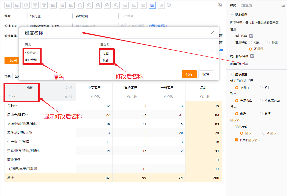 - 维度名称:默认按维度名称展示,可自行修改展示内容