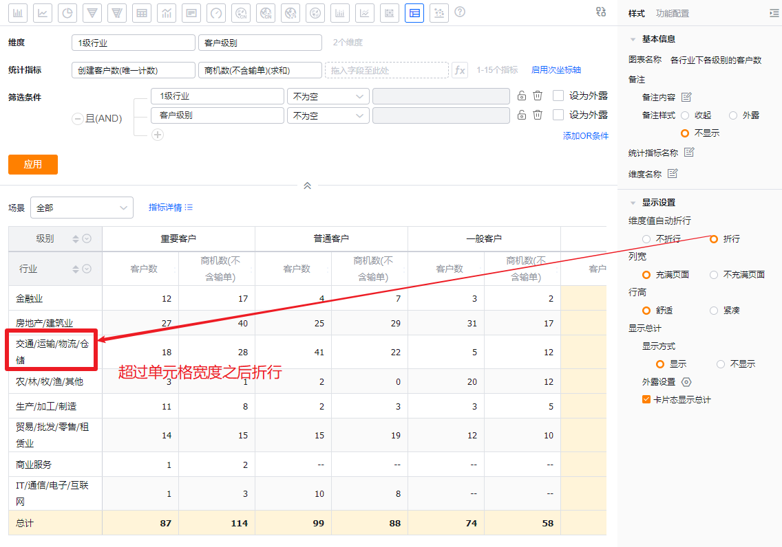 - 维度值自动折行:默认不折行,可切换为折行