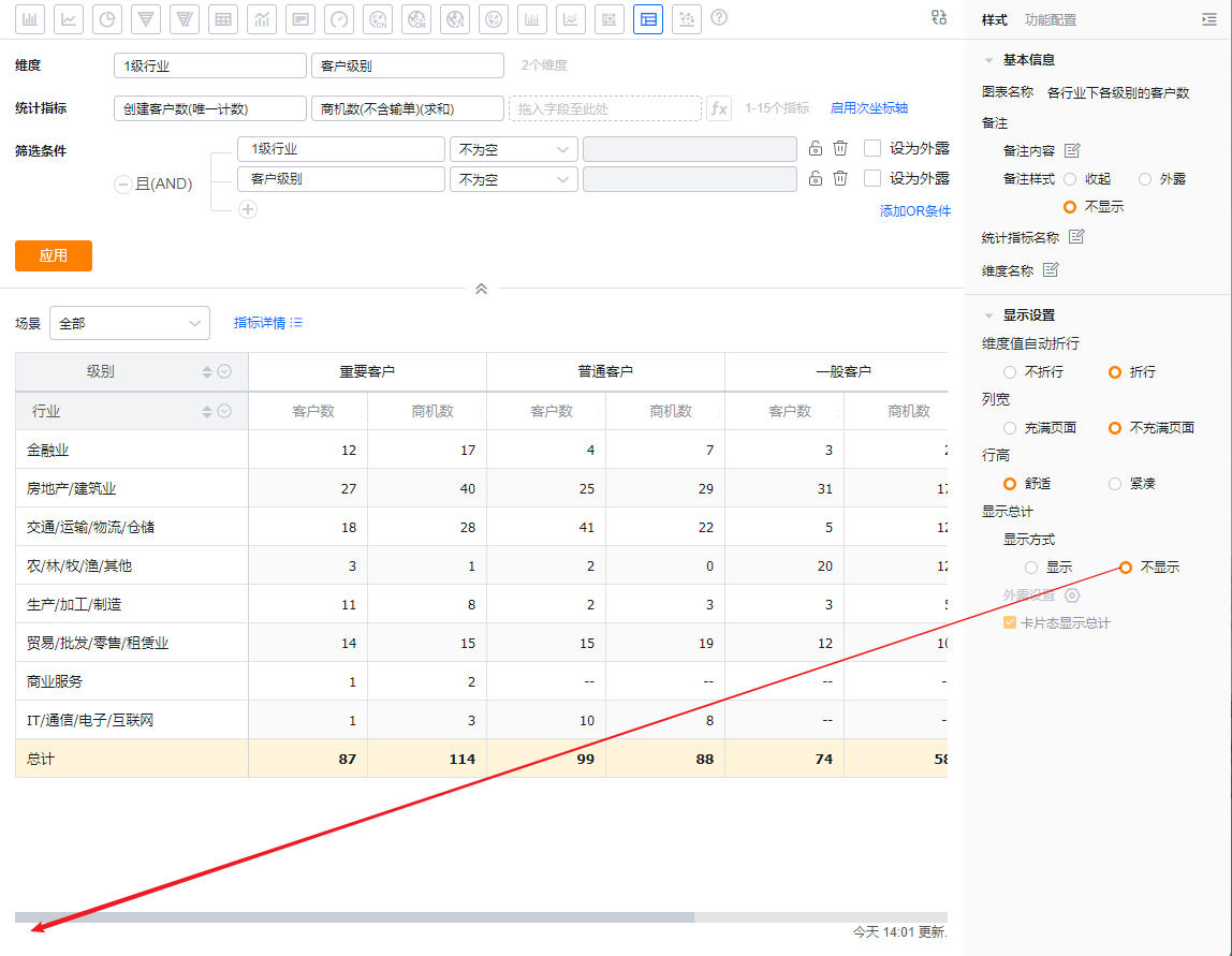 - 横向总计:默认勾选,展示在底部,可切换为顶部;取消勾选后,底部/顶部变为只读