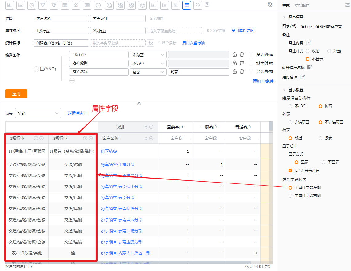 - 属性字段顺序:当维度字段中有“主属性”字段且开启属性维度后,可以设置属性字段的顺序,默认展示在主属性字段左侧,可切换为显示在主属性字段右侧
