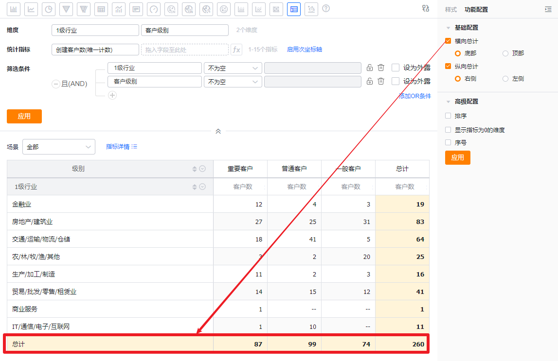 - 纵向总计:默认勾选,展示在右侧,可切换为左侧;取消勾选后,左侧/右侧变为只读