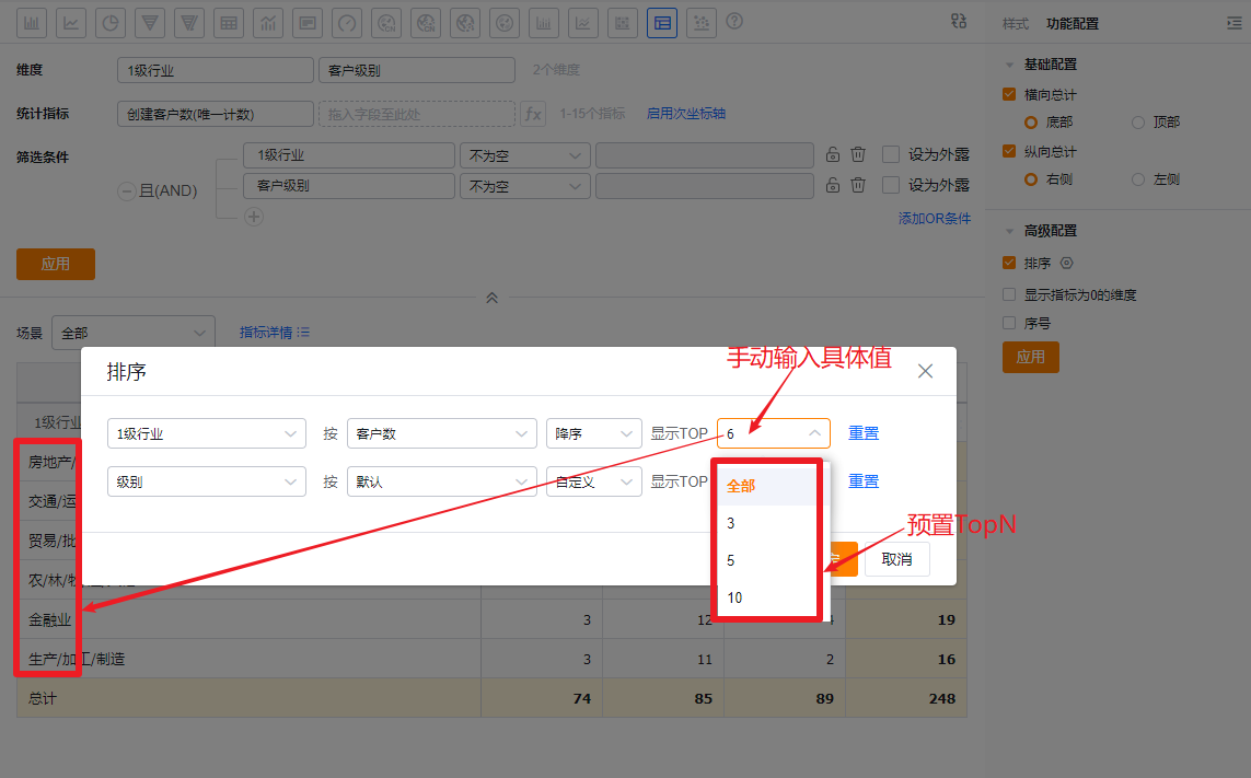 - 排序:默认不勾选,勾选后可设置维度基于本身的排序及TopN或者维度基于某个指标的排序及TopN,TopN可以选择预置的,也可手动输入具体数值