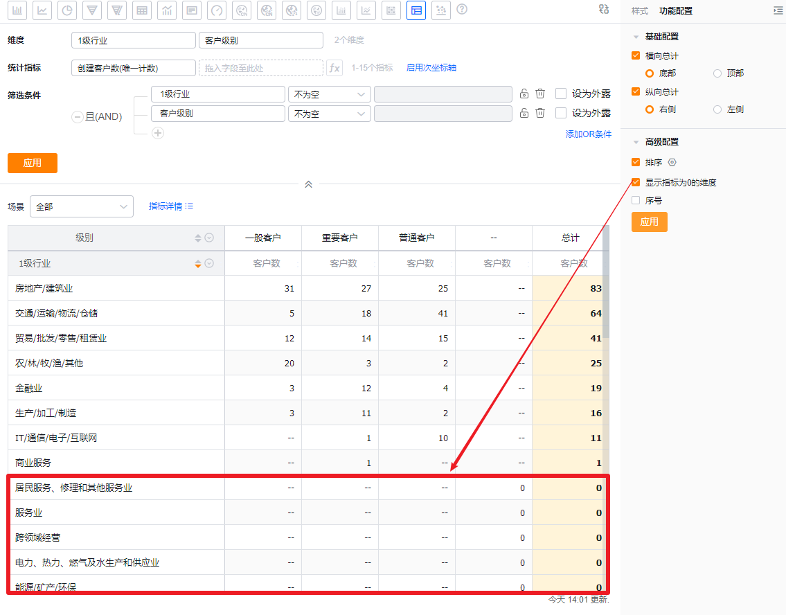 - 显示指标为0的维度:默认不勾选,勾选后展示指标为0的维度