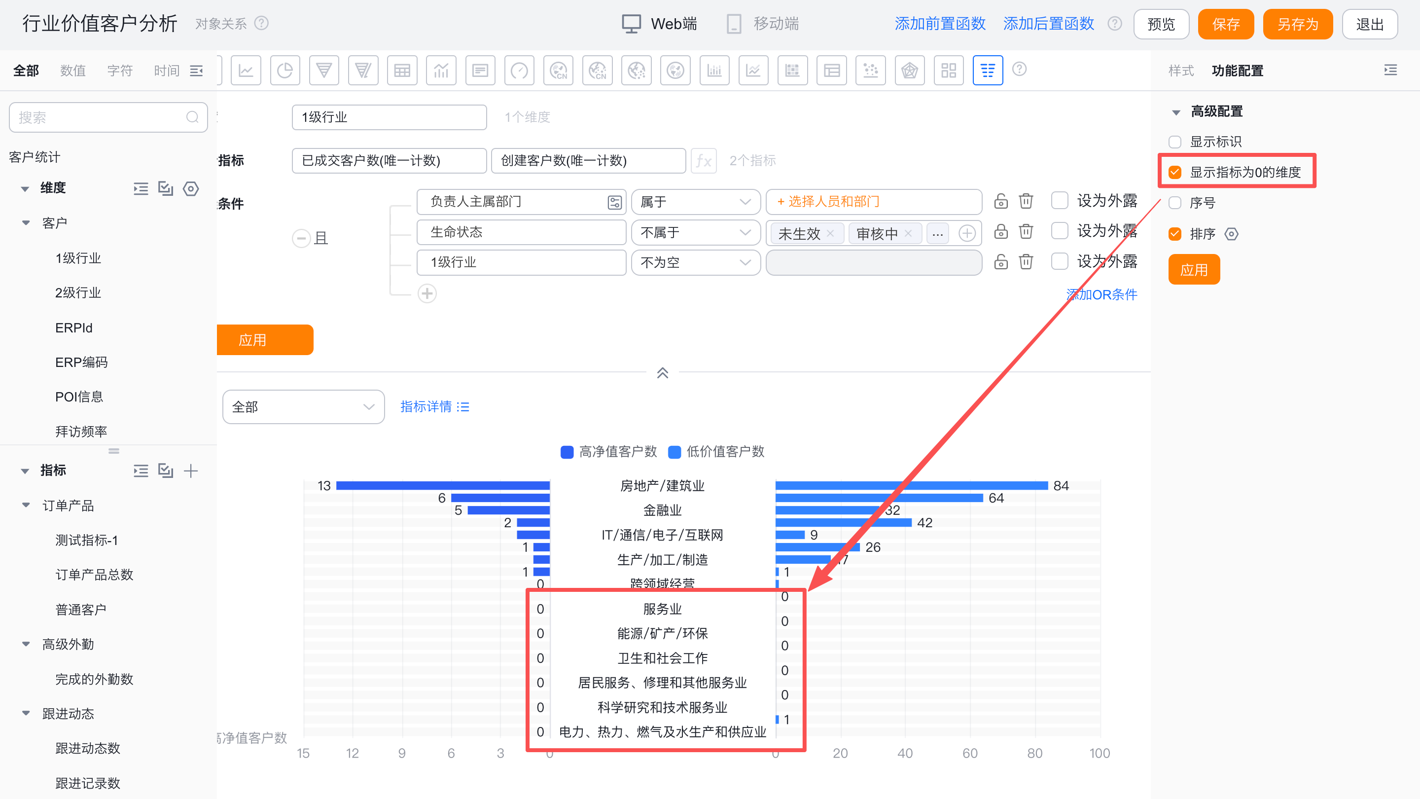 - 显示指标为0的维度:默认不勾选,可勾选后展示指标为0的维度