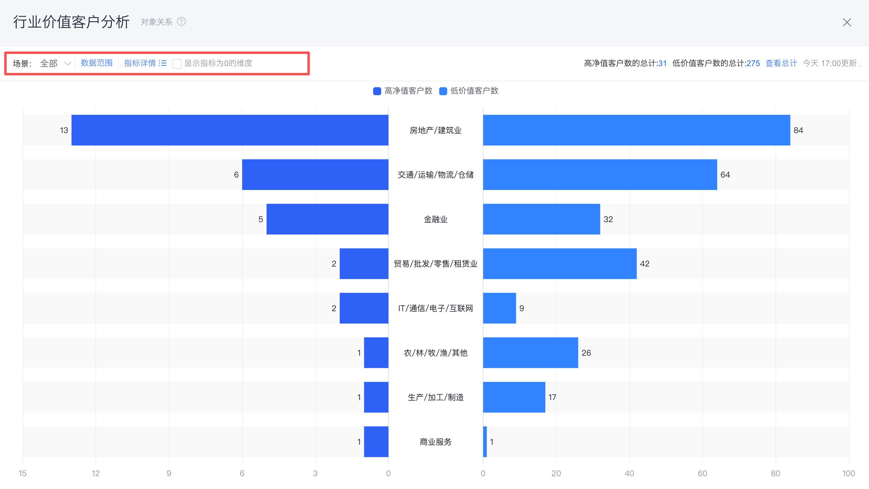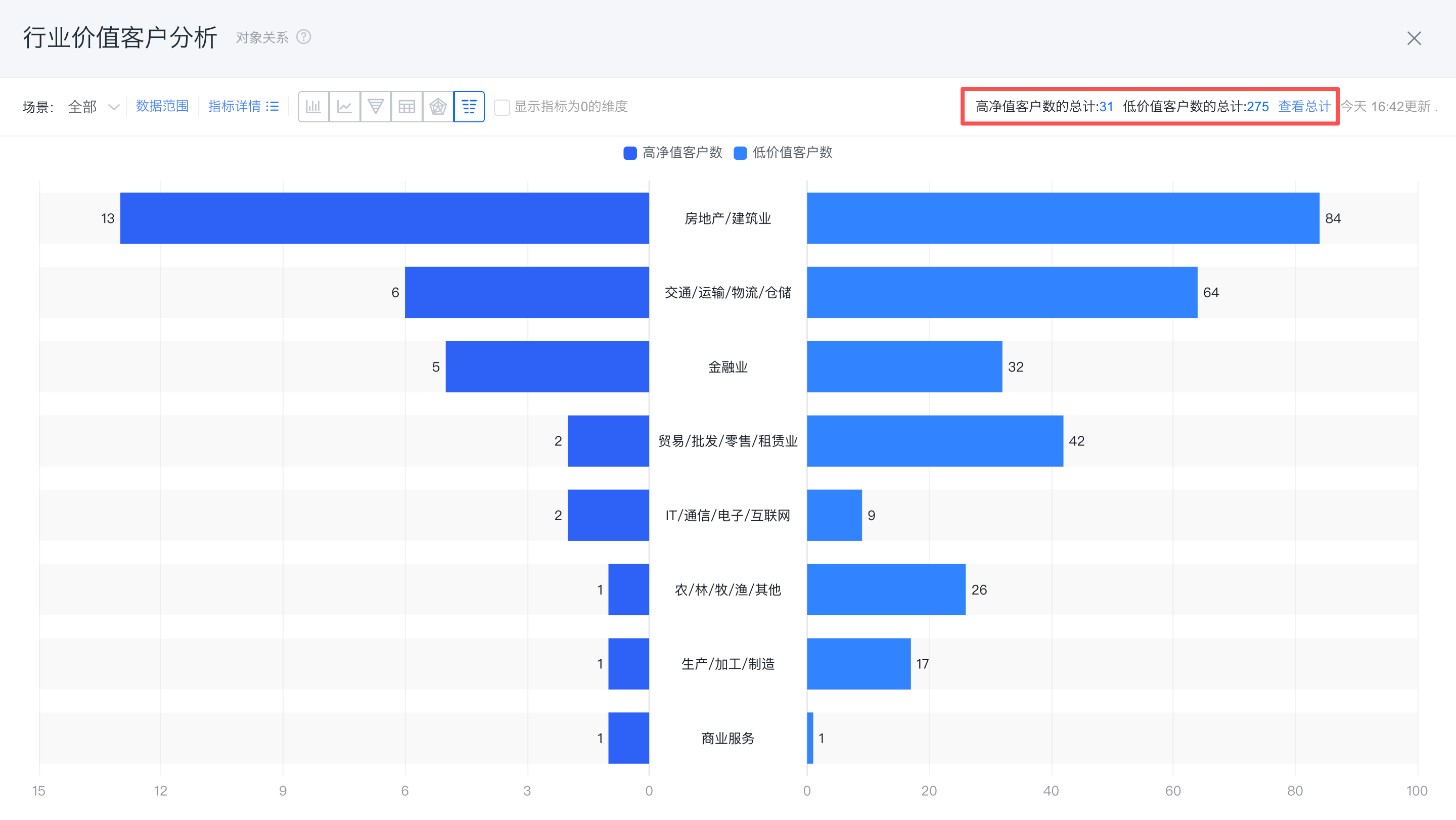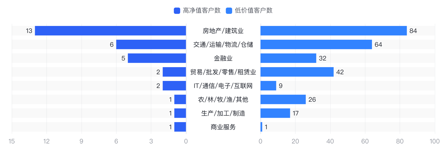 蝴蝶图可以实现对比同一维度下两个相关性指标的分布差异,如对比不同行业高价值客户与低价值客户的分布差异