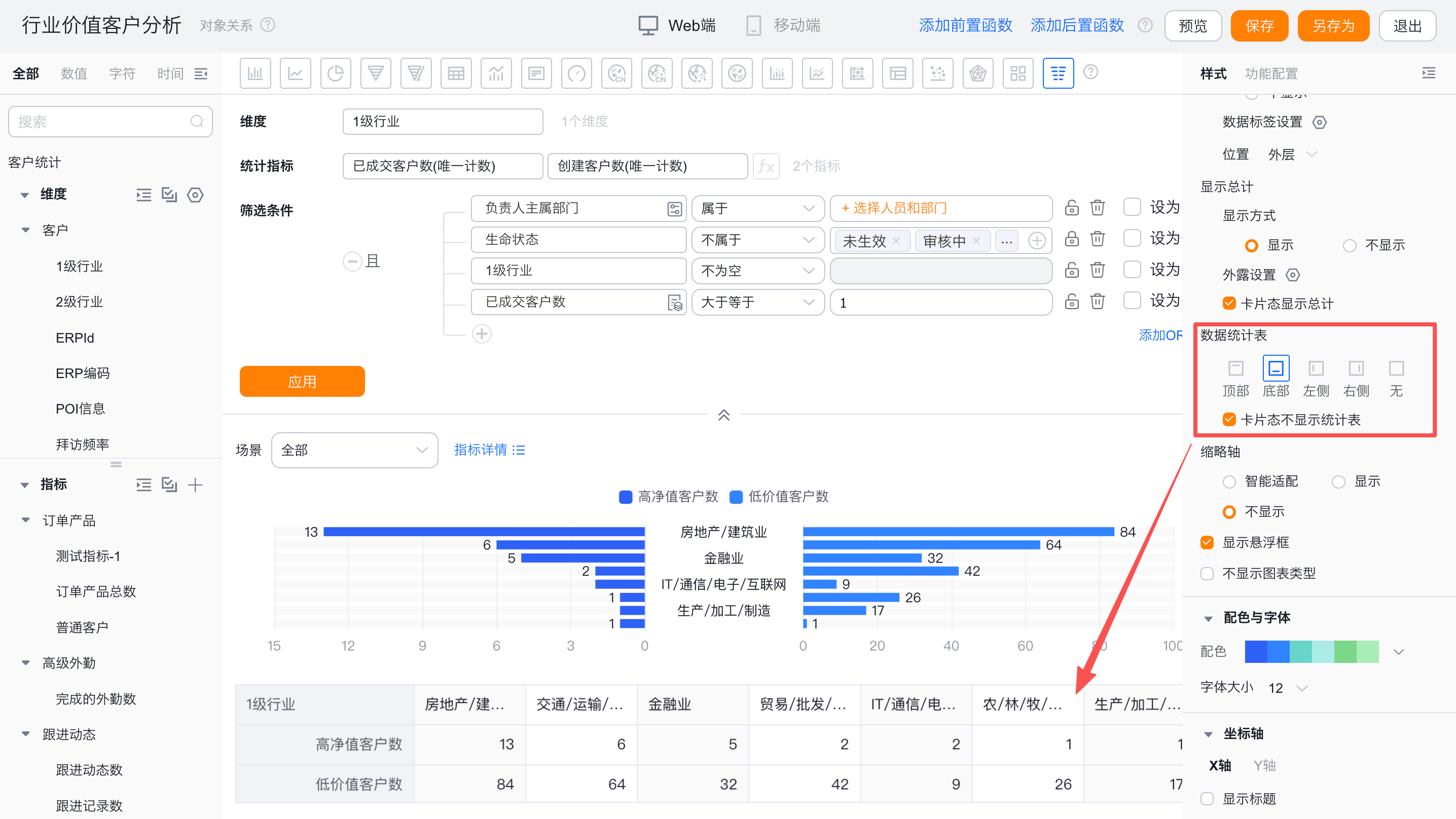 - 数据统计表:可设置是否展示数据统计表及展示位置,默认不展示,可切换为展示在图形的顶部、底部、左侧、右侧