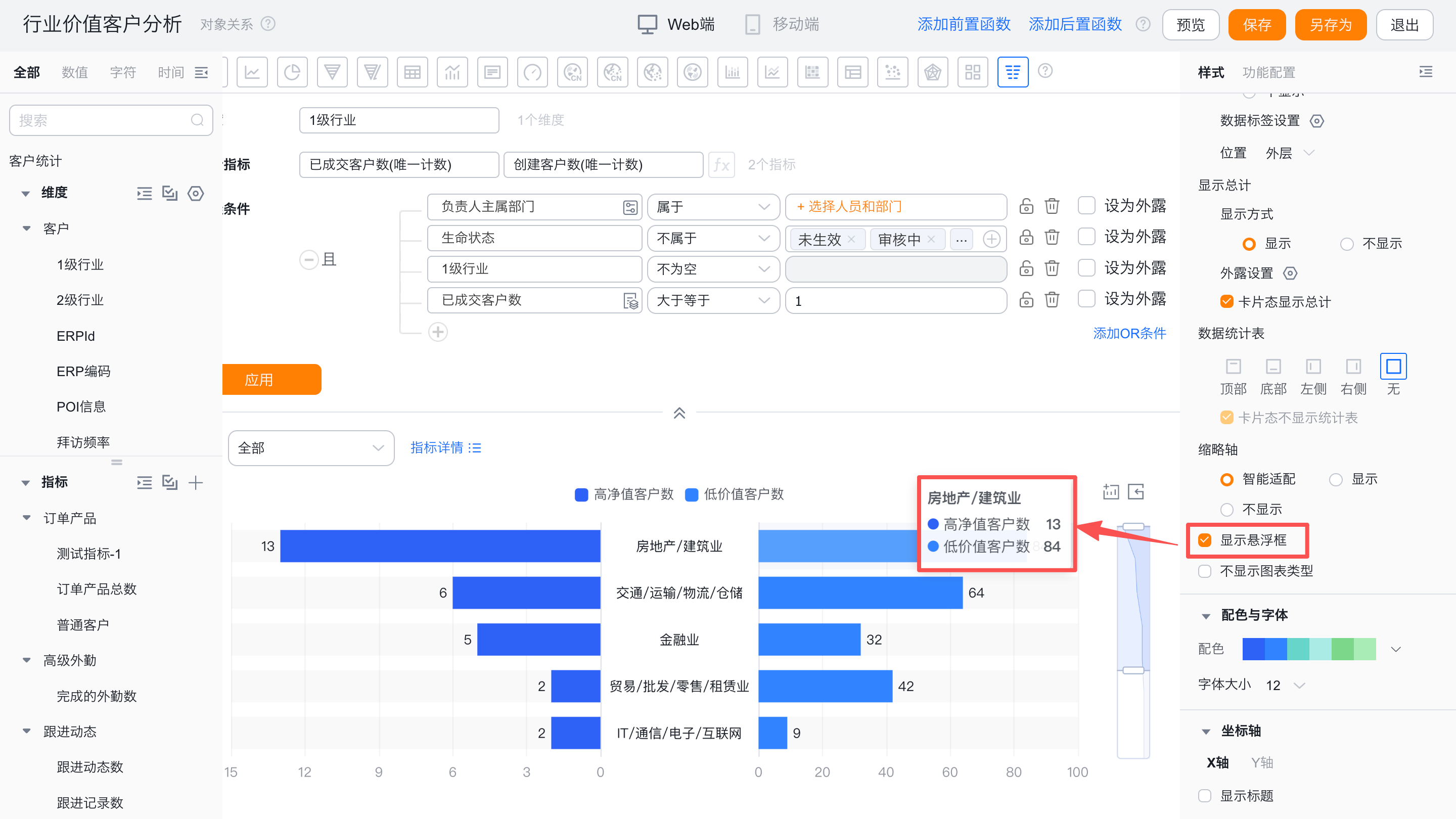 - 显示悬浮框:勾选后,鼠标hover在图形上时,会显示对应的维度值和指标值,取消勾选后,鼠标hover在图形上时,则不显示维度值和指标值