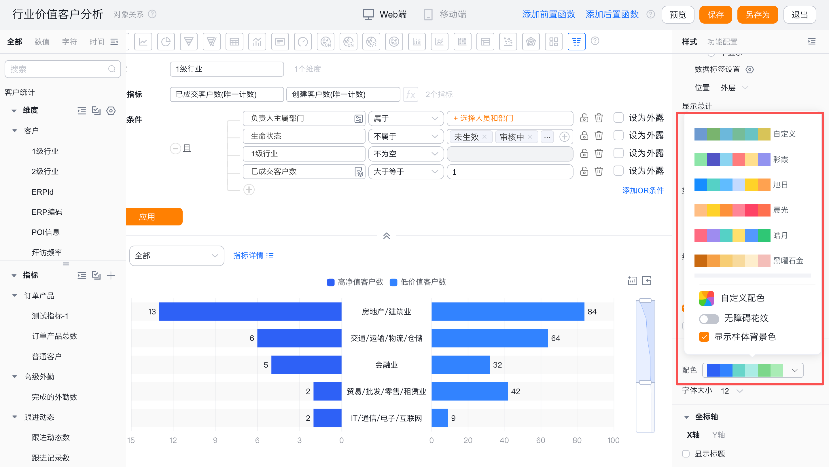 - 图表级自定义配色:可针对指标自定义设置柱子的显示颜色