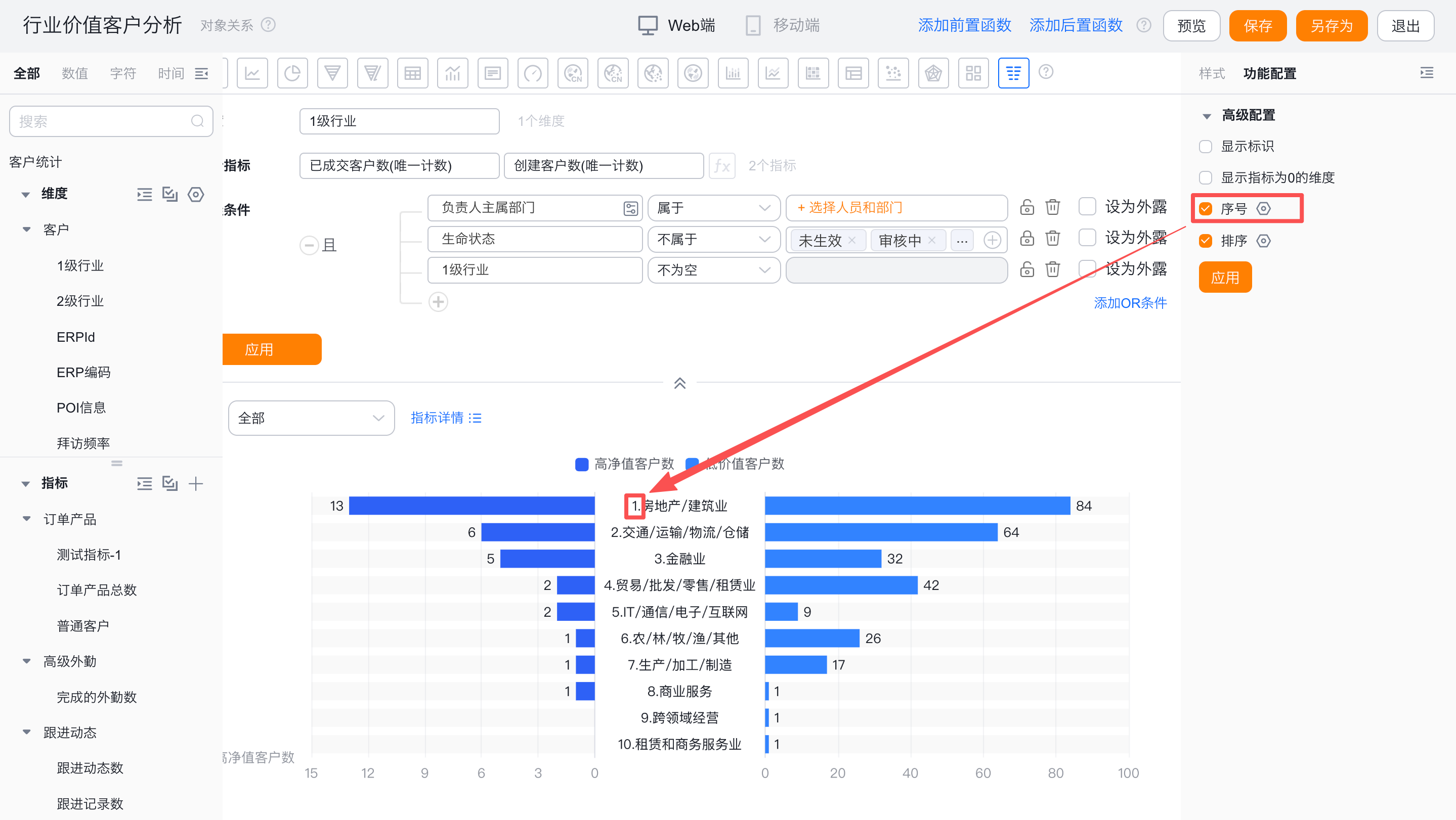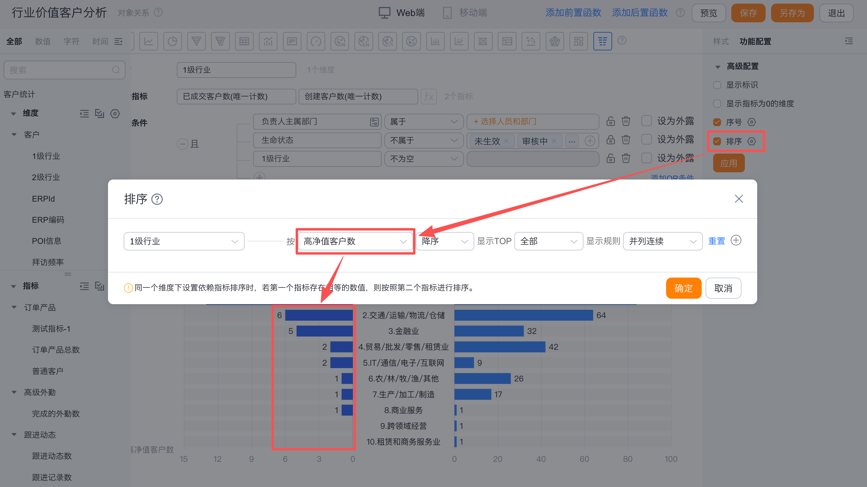 - 当维度时枚举值或者部门字段时,支持自定义排序