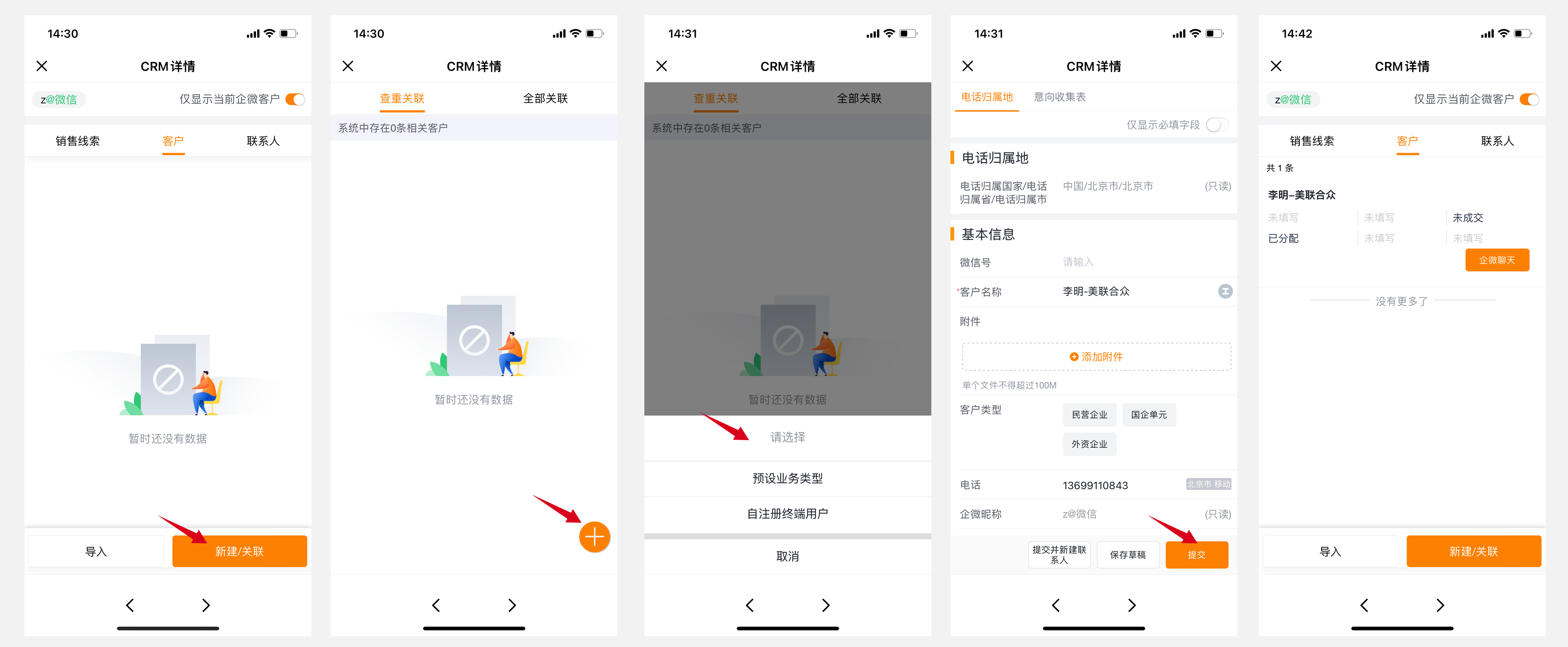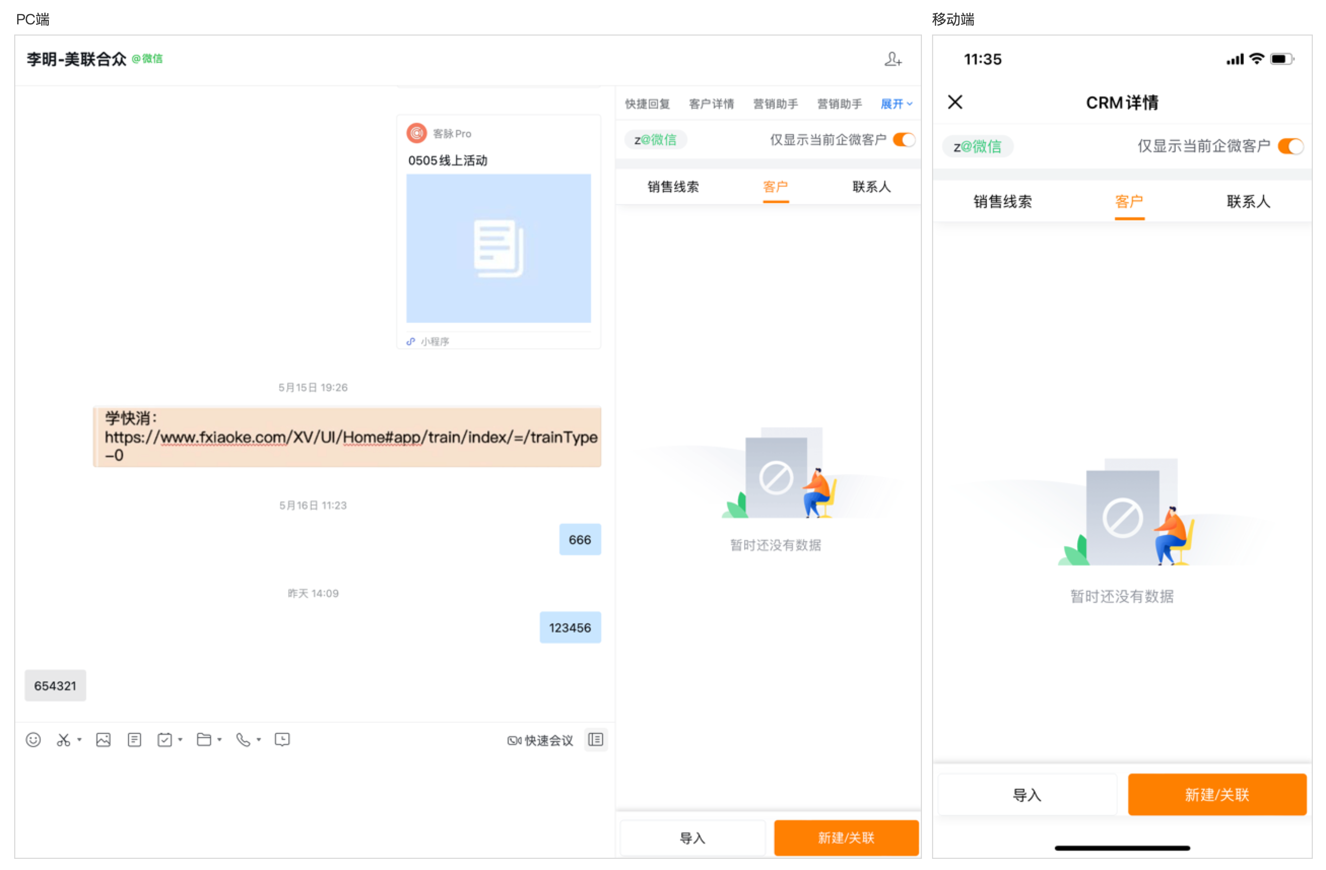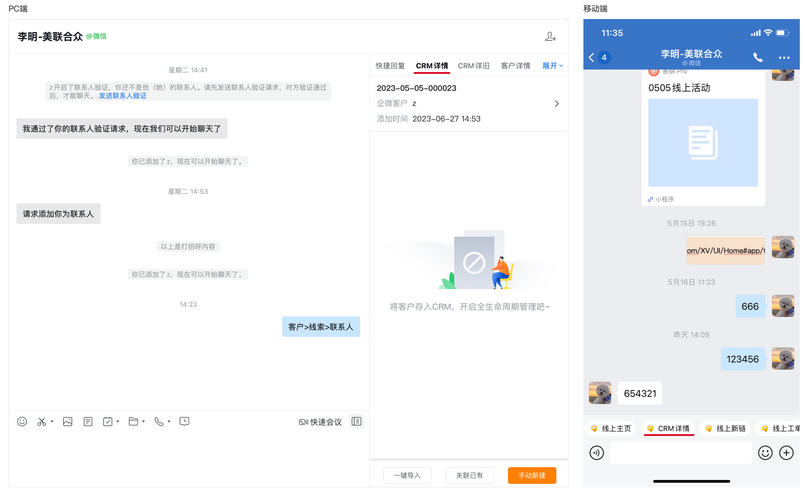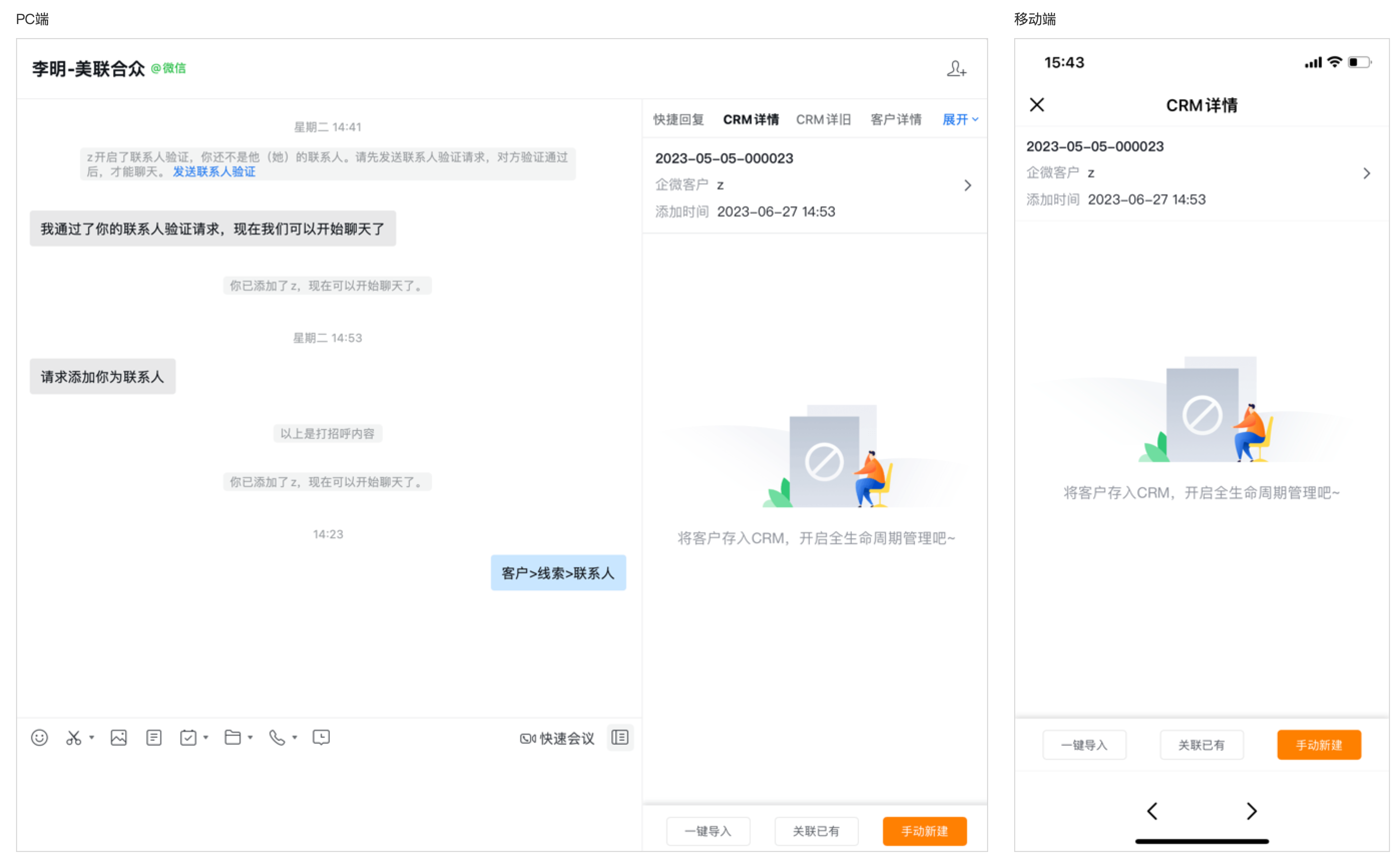 如果是先添加好友,CRM系统中并无对应客户信息,则可以通过新建操作创建一条客户数据进行关联。