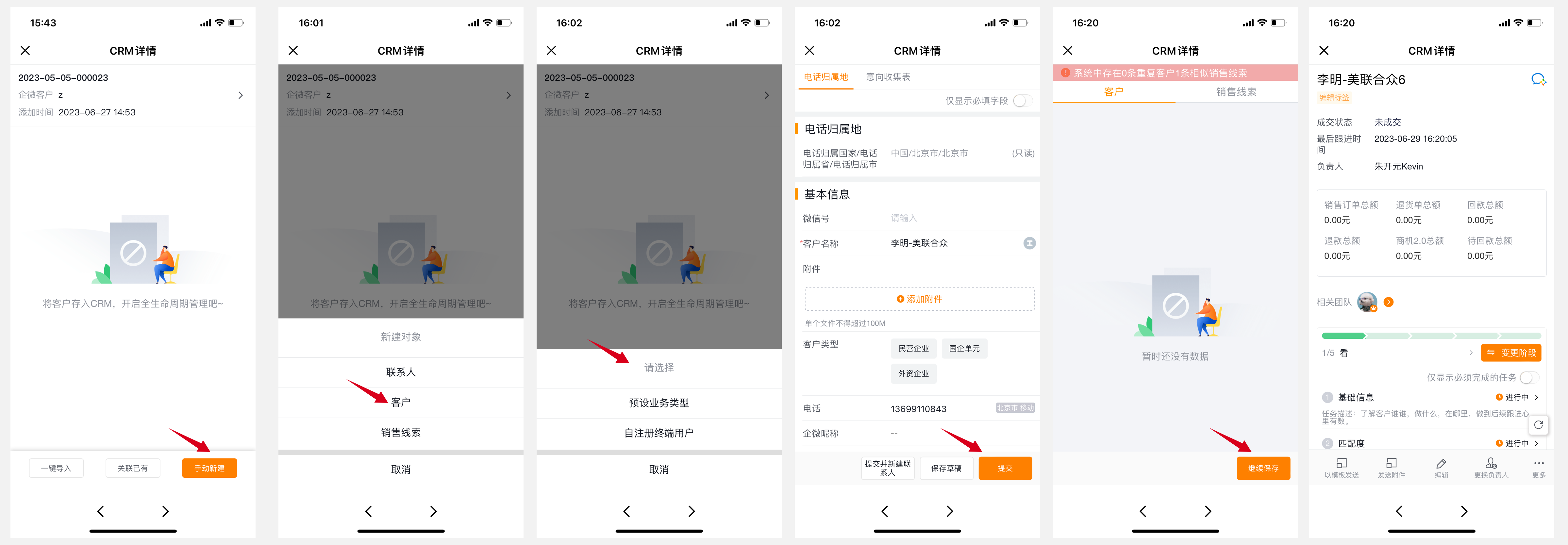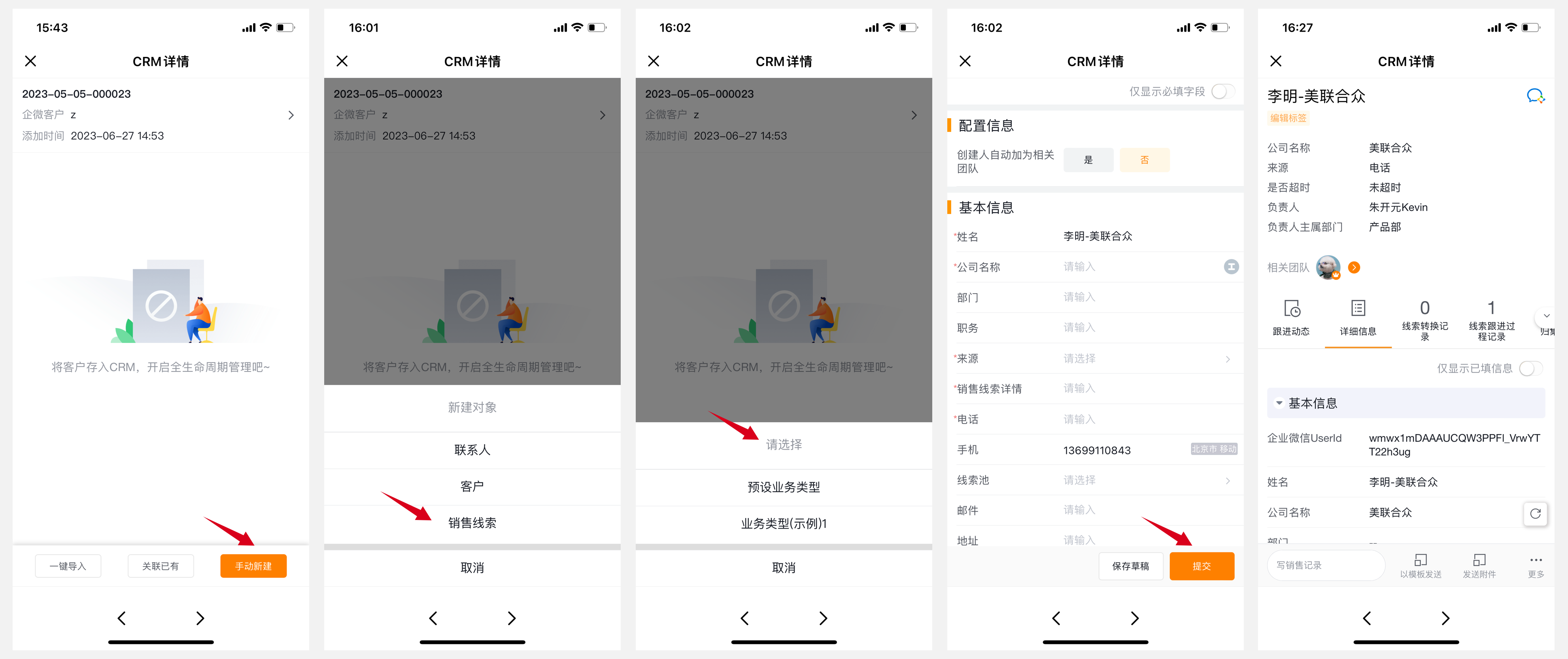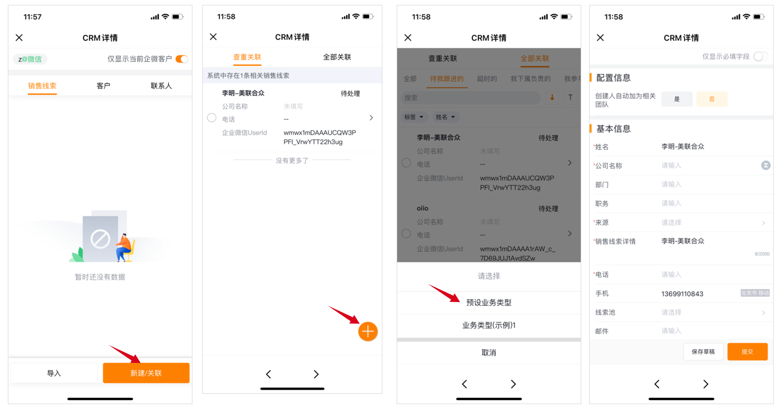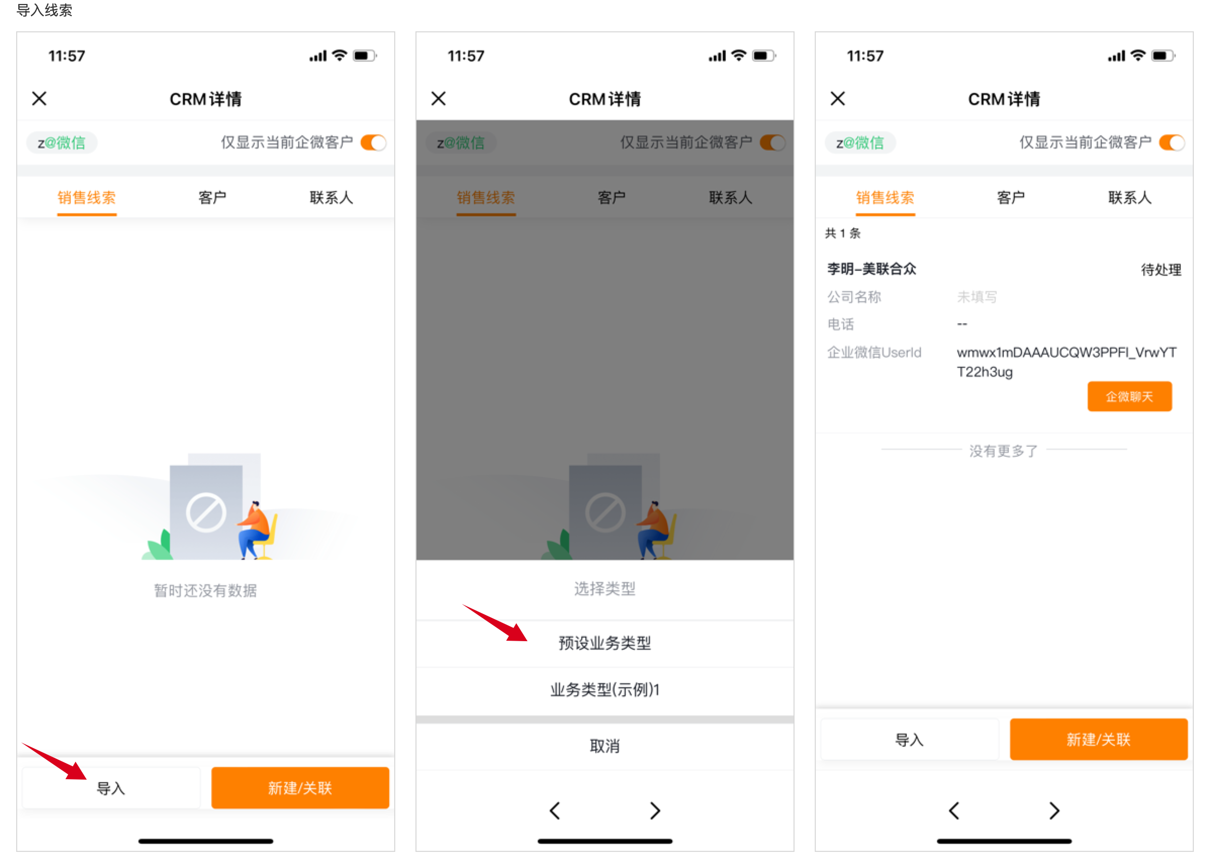 如果是先添加好友,CRM系统中并无对应销售线索,且该好友所属企业已在CRM客户列表中,则可以通过新建操作创建一条销售线索与该好友关联