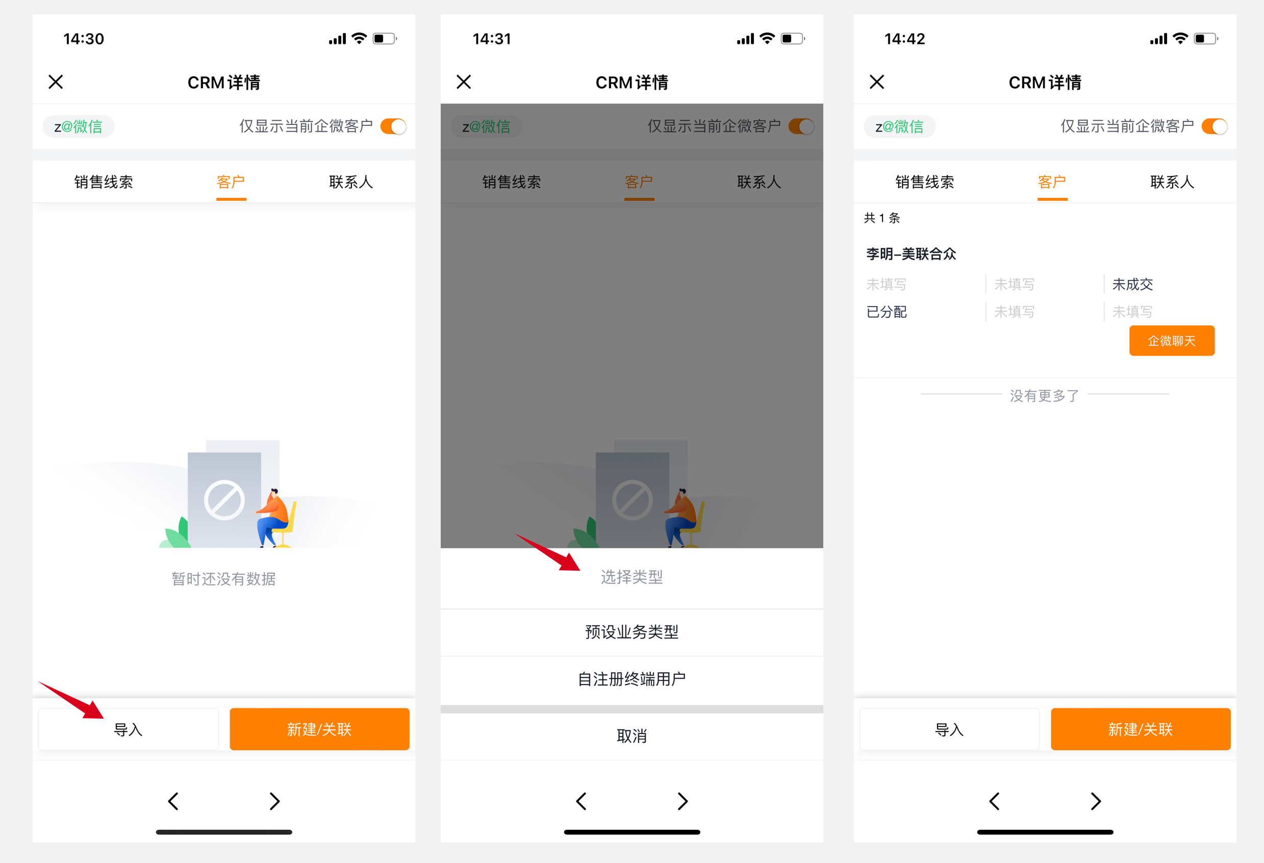 如果是先添加好友,CRM系统中并无对应客户数据,除新建外,还可以通过导入操作快速创建一条客户数据进行关联(字段完整性没有单独新建灵活全面);