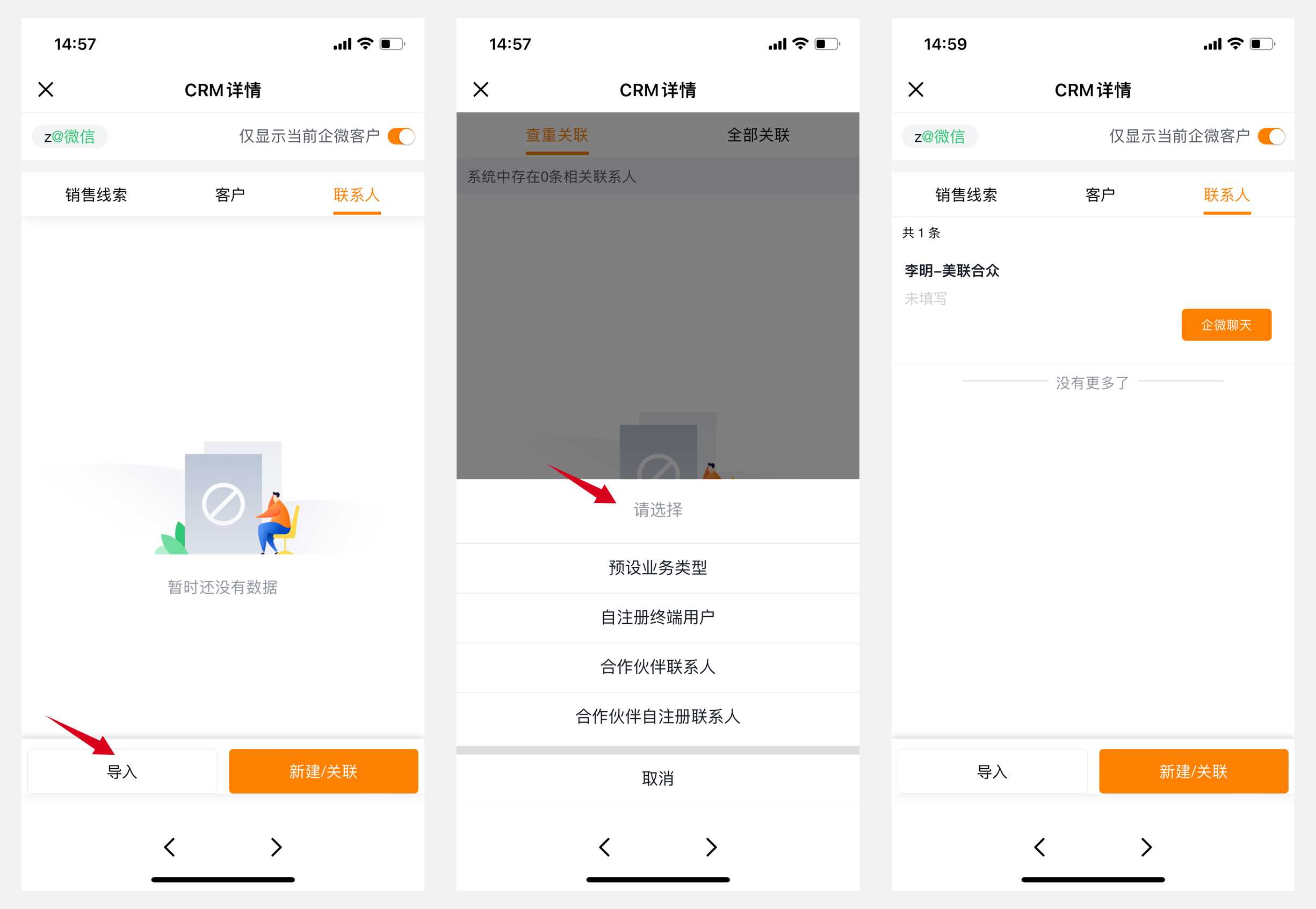 如果是先添加好友,CRM系统中并无对应联系人信息,除新建外,还可以通过导入操作快速创建一条联系人数据进行关联(字段完整性没有单独新建灵活全面);