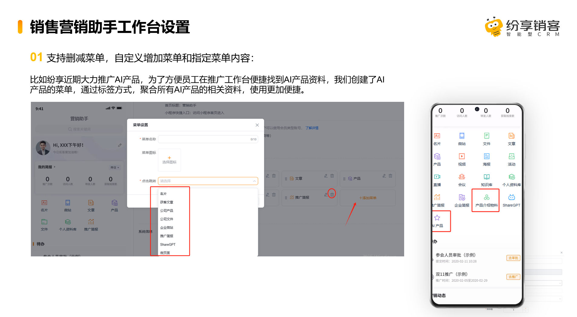 支持自定义营销推广工作台的菜单及内容: