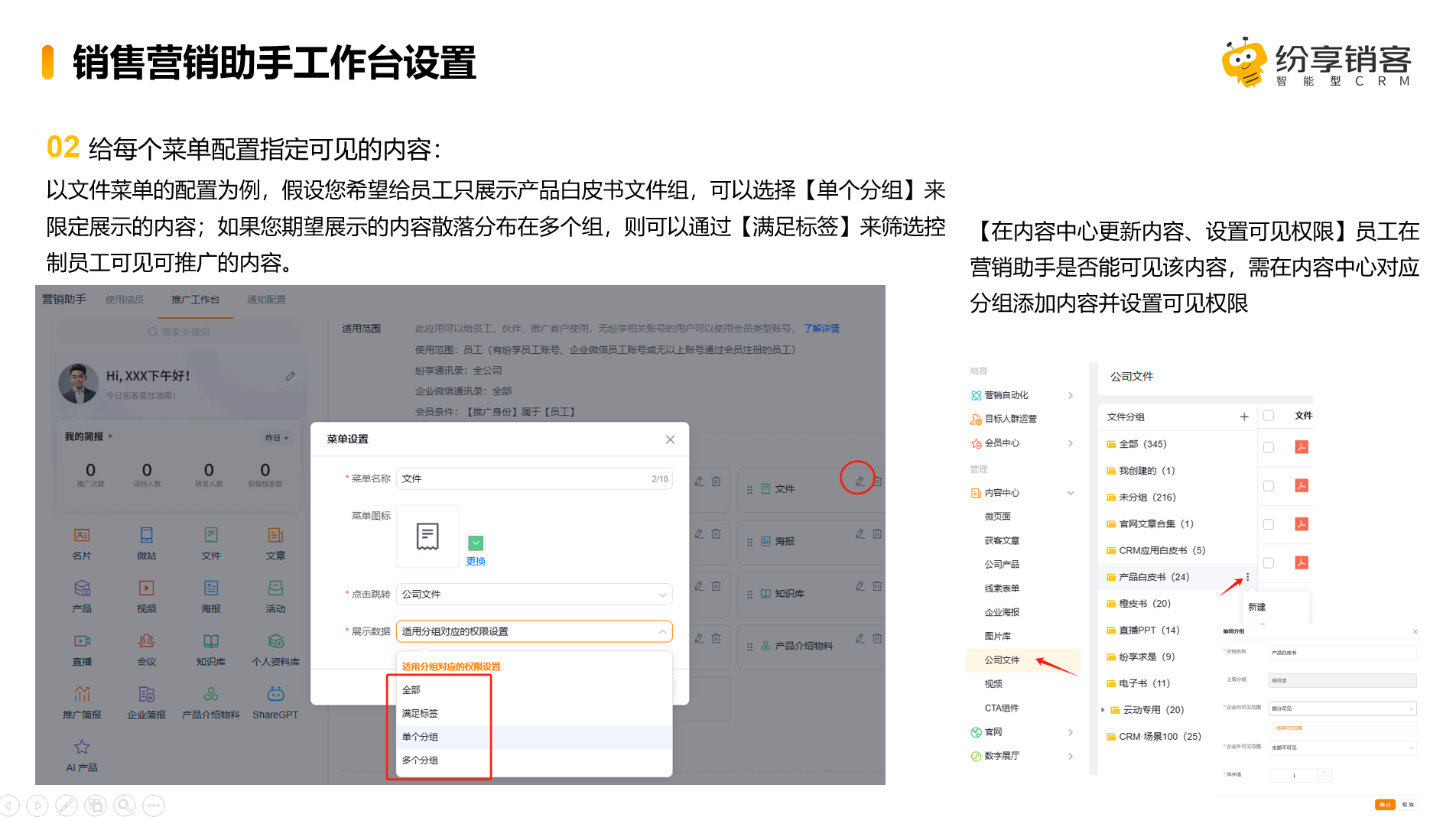 操作路径:①设置推广工作台&更新【内容中心】各类型资料-②打开企业专属微信小程序检查更新情况注:营销通-内容中心上传的资料和营销活动中对外开放的活动内容,会自动同步在-绑定营销通的微信小程序-员工营销助手-推广资料中;您只需在营销通后台更新并设置相应权限即可。
