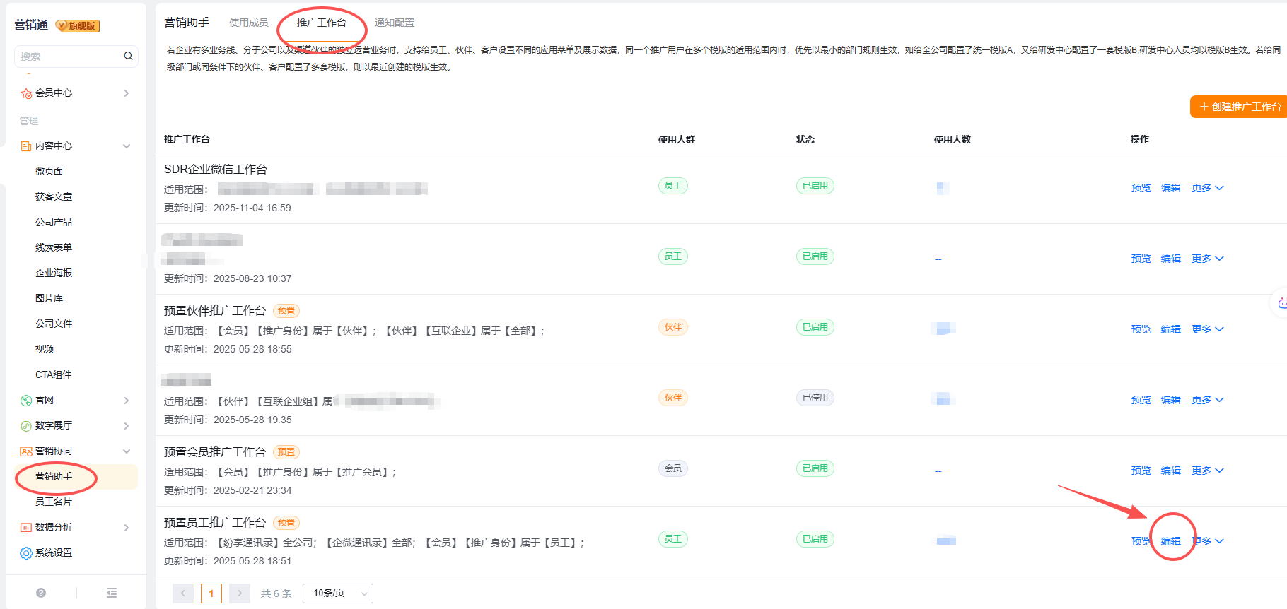 进入营销通-营销协同-营销助手-推广工作台,选择所需设置的工作台,点击编辑: