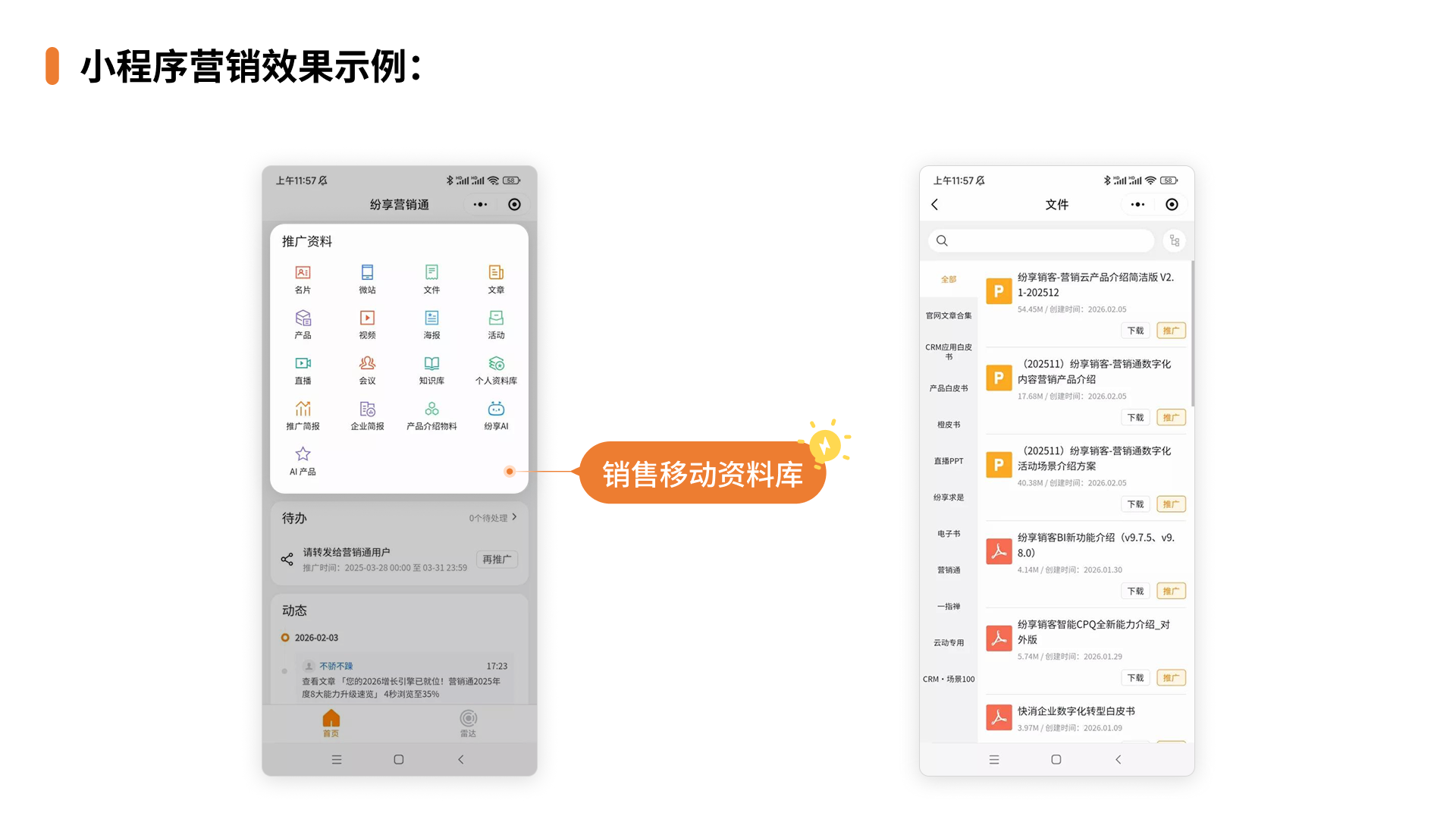 通过营销通绑定企微专属微信小程序,搭建移动素材库,把产品介绍、案例、白皮书、视频都传到营销通-内容中心,分好类后自动同步到微信小程序营销助手。