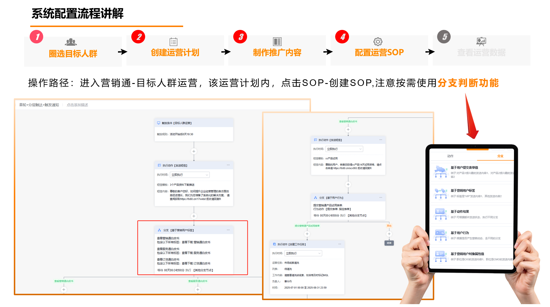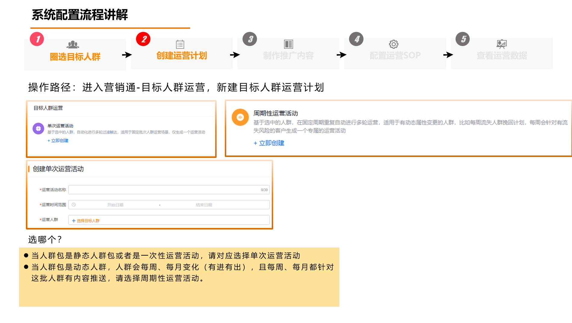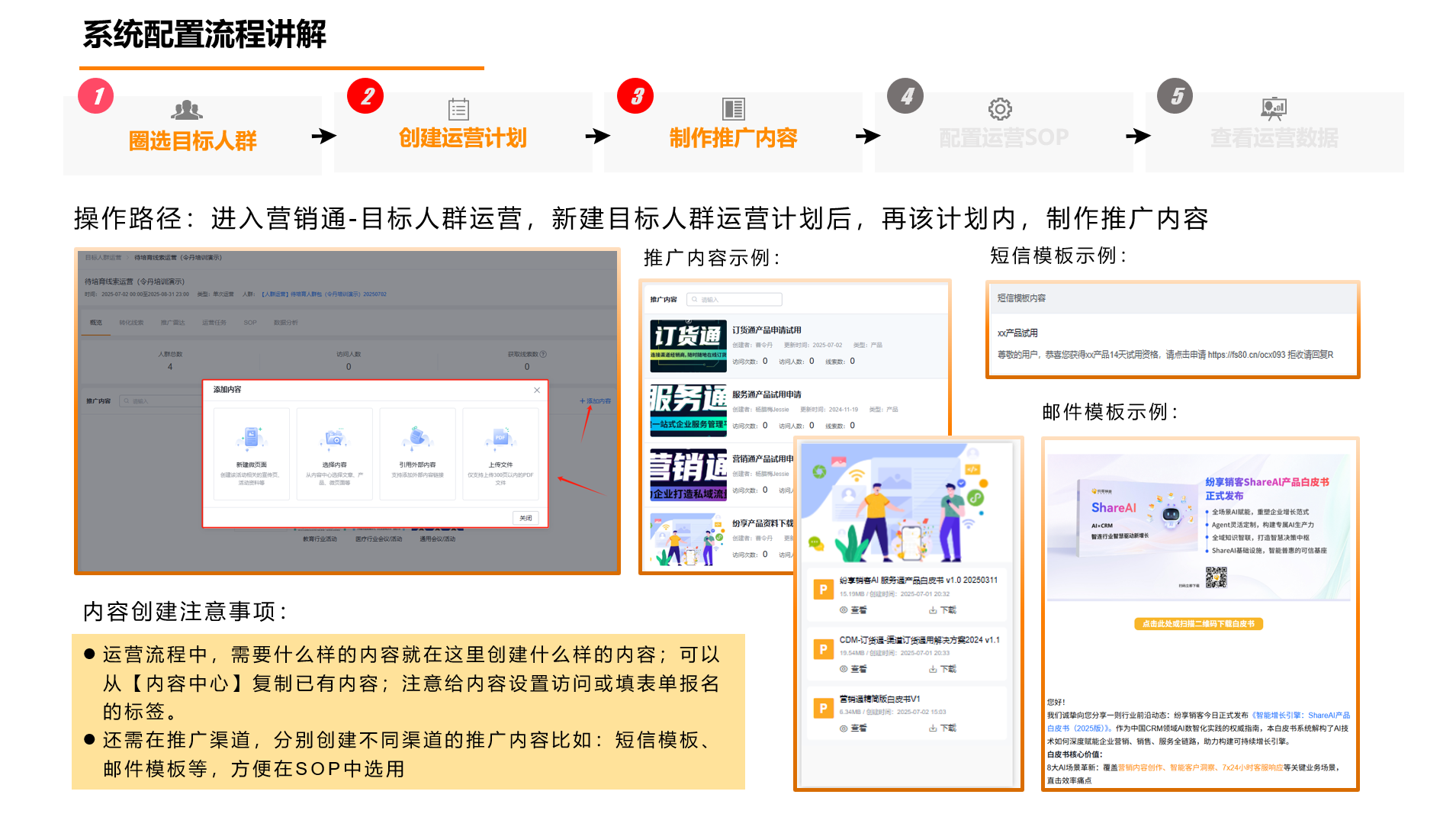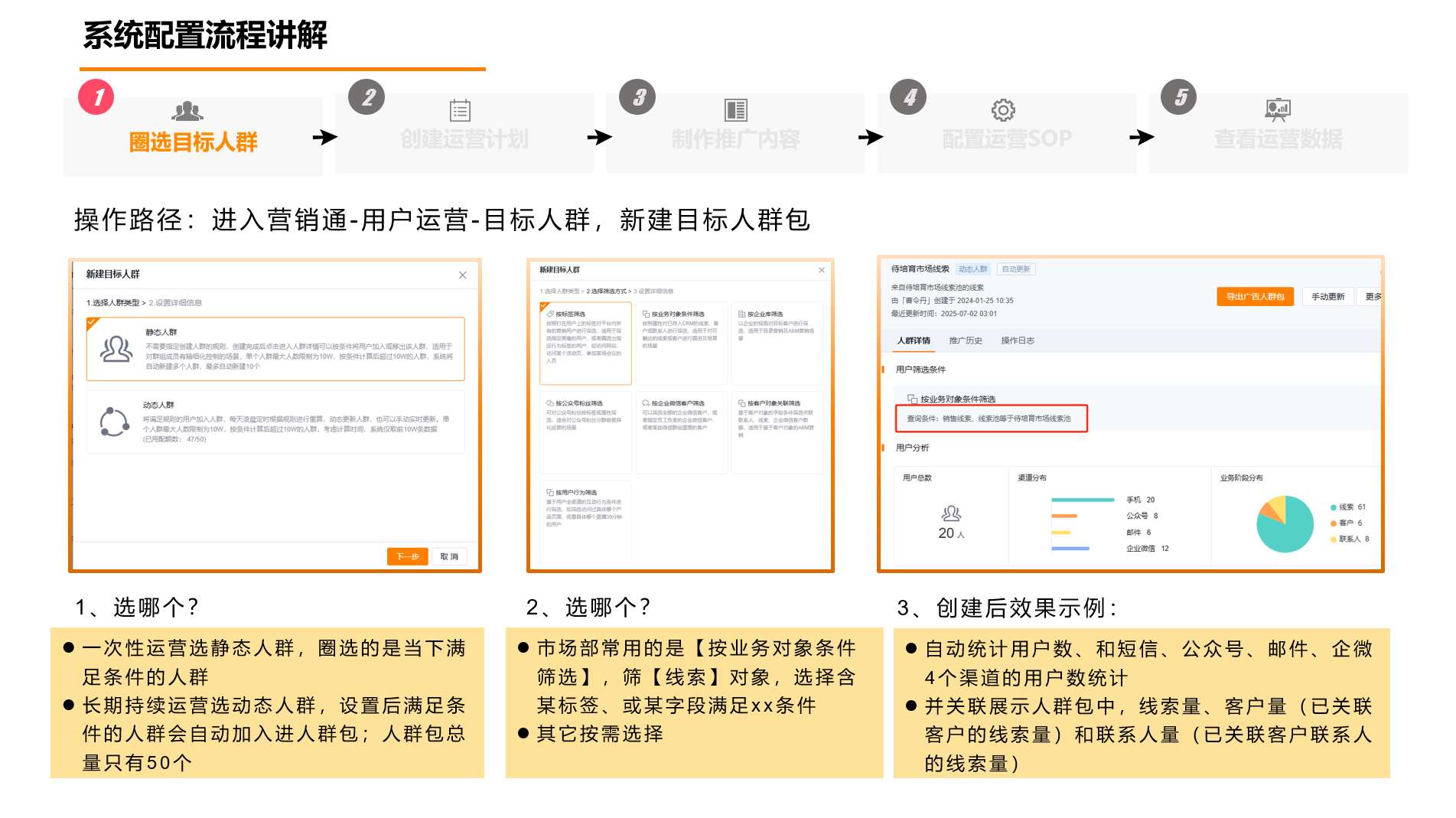 操作路径:①创建待激活目标人群包-②新建目标人群运营计划-③创建营销内容、推广内容-④设置内容推广运营SOP流程-⑤查看目标人群运营数据