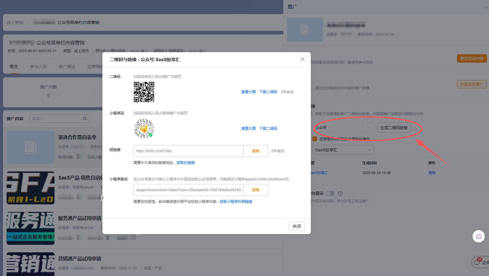 点击推广内容-【推广】按钮-选择推广渠道-生成二维码链接,保存后,方便随时来复制使用。