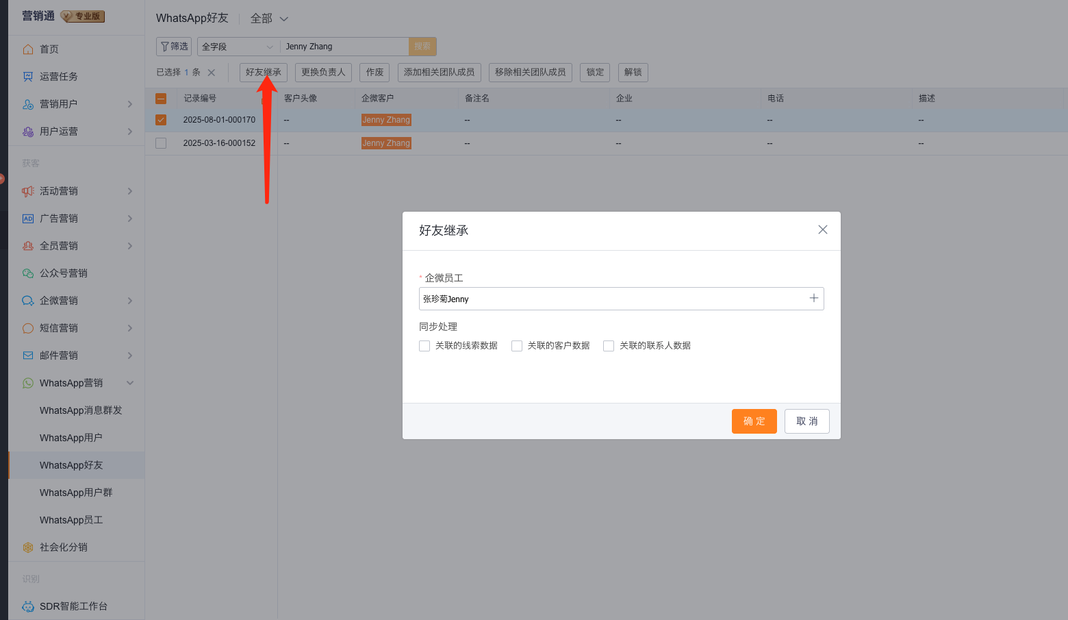 IM好友(企微好友) | 同步WhatsApp的好友数据,多个员工加多个好友有多条记录 |
