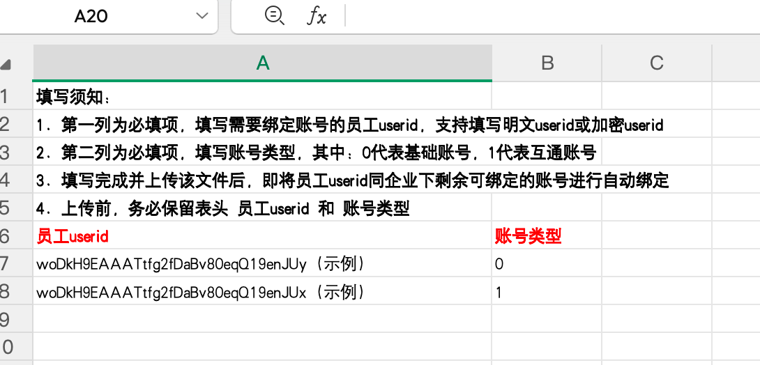 3、下载下方的模板,整理需要激活员工的userid,请勿修改表格格式及新增字段,账号类型大部分企业都采购的互通接口,只有互通接口才能同步企微客户及客户群相关信息,都需要设置1,也可以联系客户经理确认。