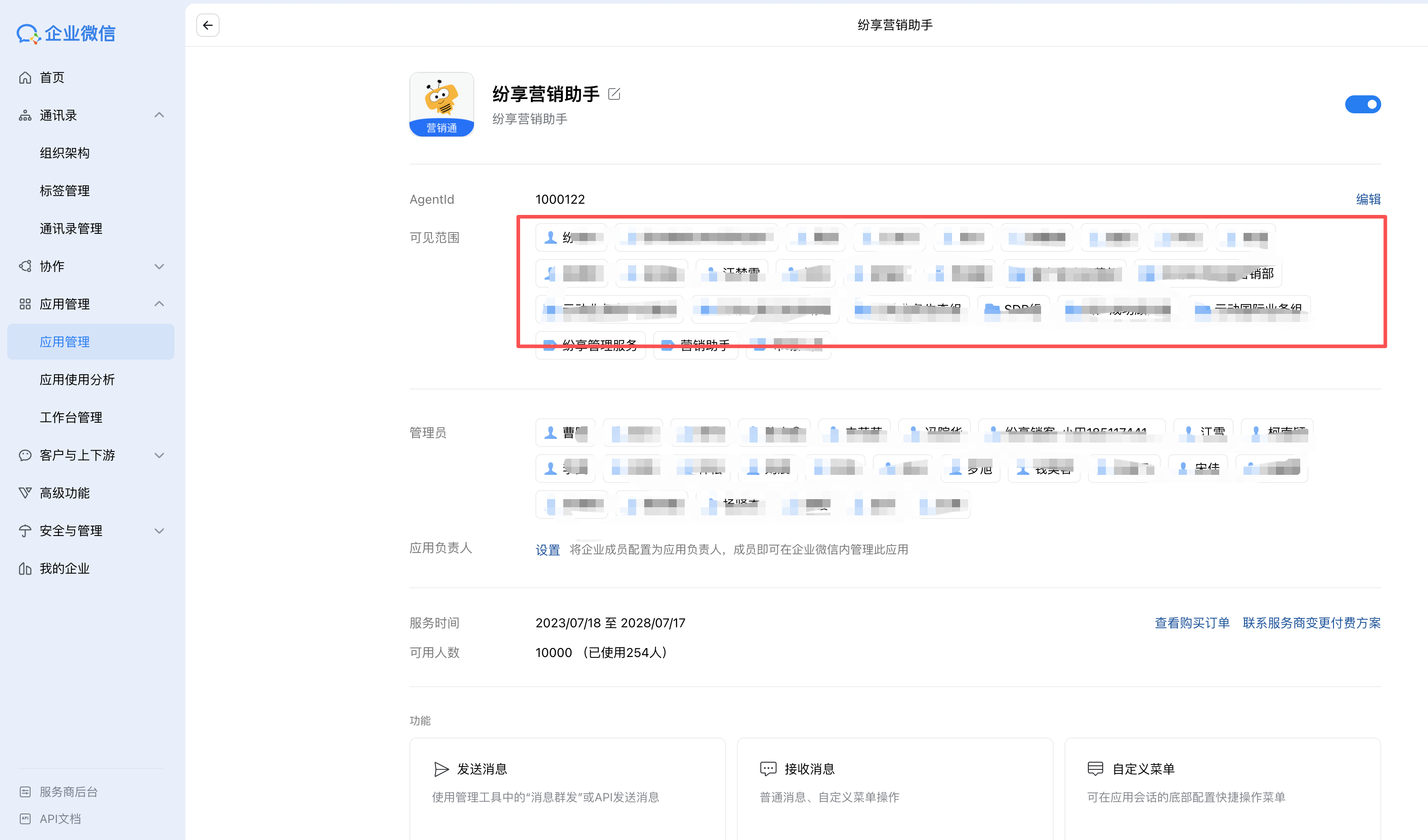 最后等待应用审核,审核通过后会收到一条安装完成通知,此时再次进入自建应用列表,查看当前安装的营销助手应用(两个应用),点击详情设置应用可见范围(一定要设置,不然同步不到员工数据,且两个应用范围一致),前三个月免费阶段暂无使用人数限制,可以选择全公司。三个月后企微接口收费,需要合理设置应用可见范围。