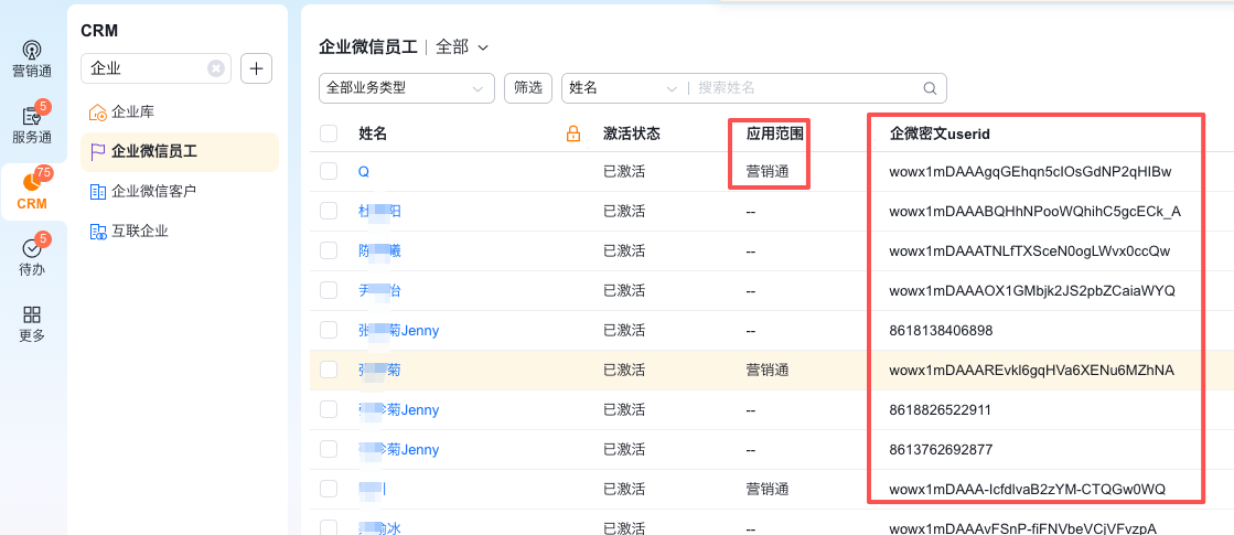 2、登录CRM后,可以在菜单管理中放出【企业微信员工】对象列表,或者直接访问 https://www.fxiaoke.com/XV/UI/Home#crm/list/=/WechatEmployeeObj 查看同步的企微员工数据,按【应用范围】可以过滤需要使用营销助手的员工,然后导出【企微密文Userid】字段。