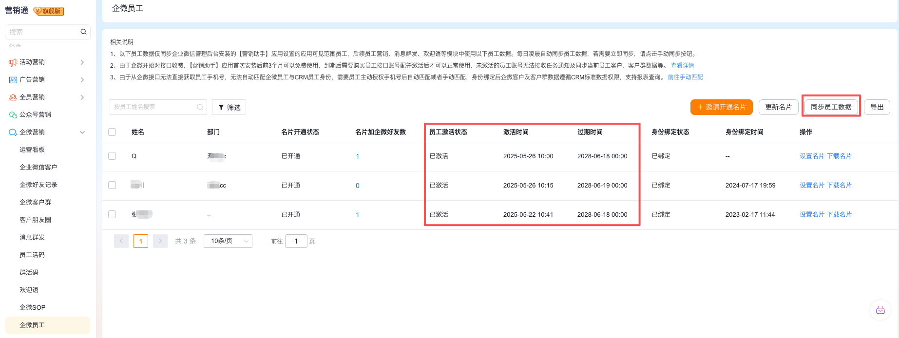 5、营销顾问完成后,前往营销通【企微营销>企微员工】列表,点击右上角【同步员工数据】,等待一两分钟后,刷新查看员工激活状态以及激活时间范围。如没有更新,可以咨询营销顾问。