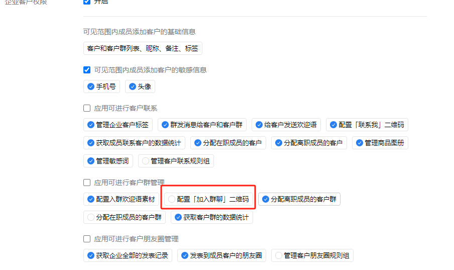 如果下单后还有提示,联系企微管理员,检查自建应用中安装的【营销助手】权限是否勾选了【配置加入群聊二维码】权限