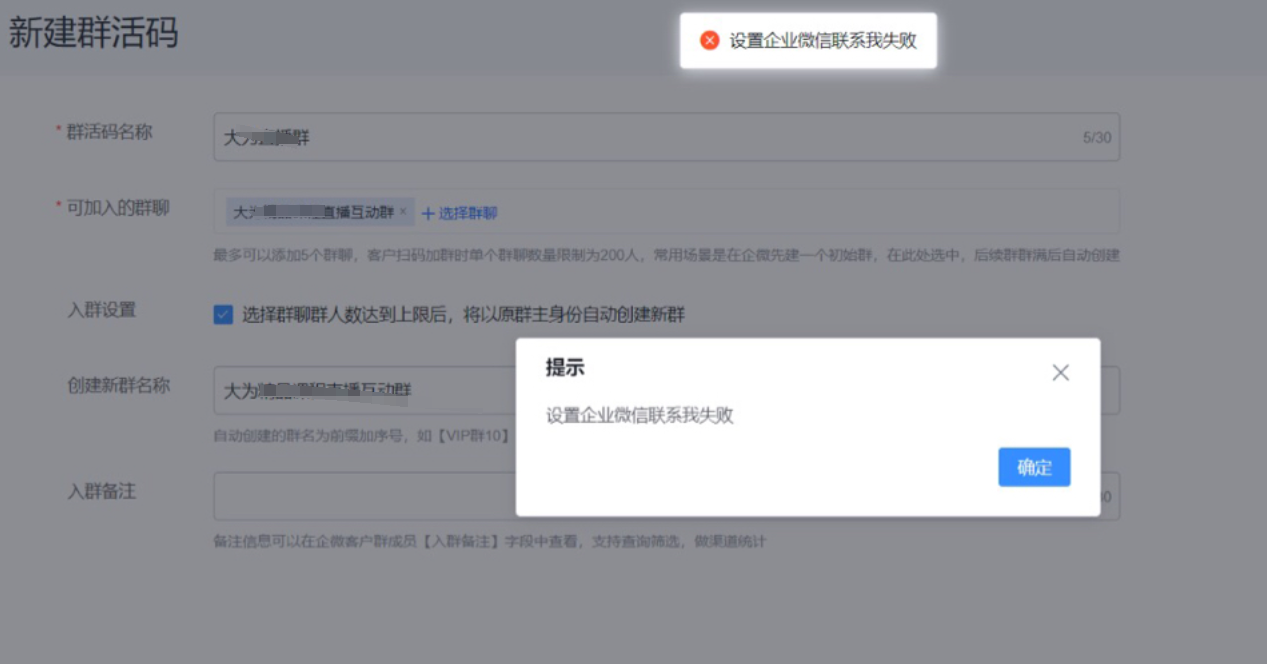 a、保存时提示【设置企业微信联系我】失败,原因是企微针对群活码接口独立收费,需要联系营销通产研下免费订单后才可以,目前是免费阶段。