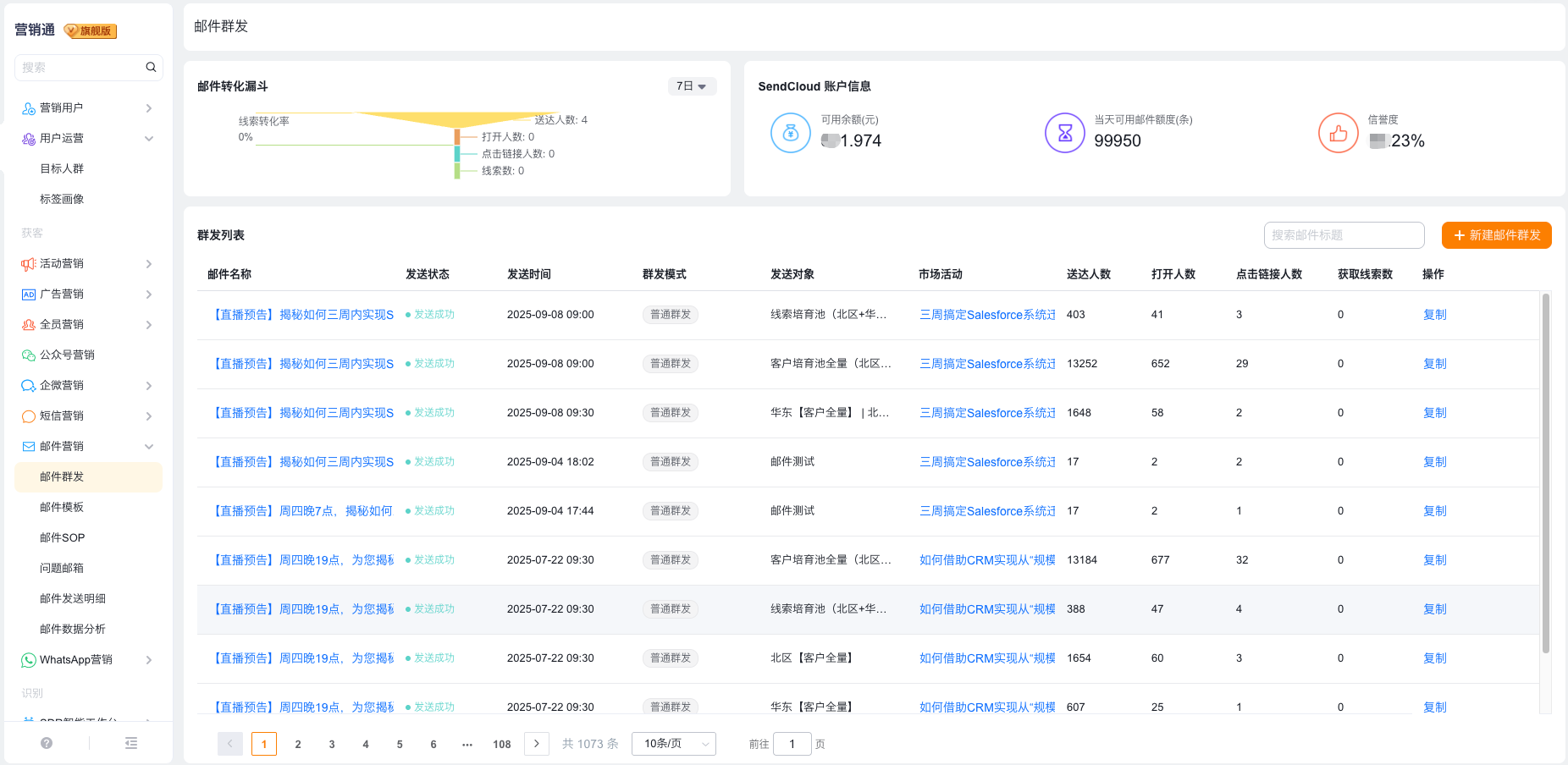 市场人员在【邮件营销】开通后,只要拥有邮件配额即可向目标客户群体进行邮件群发。