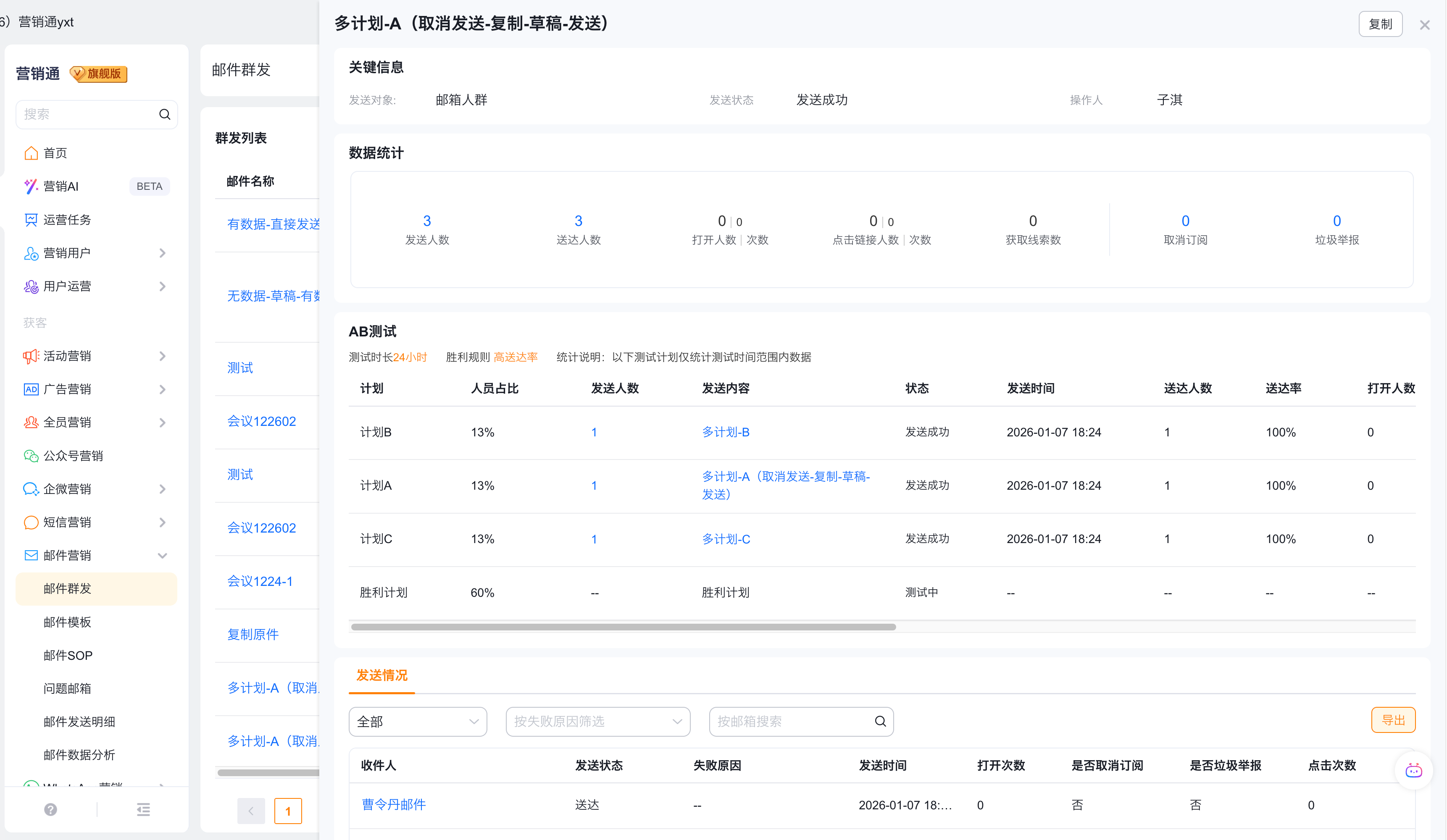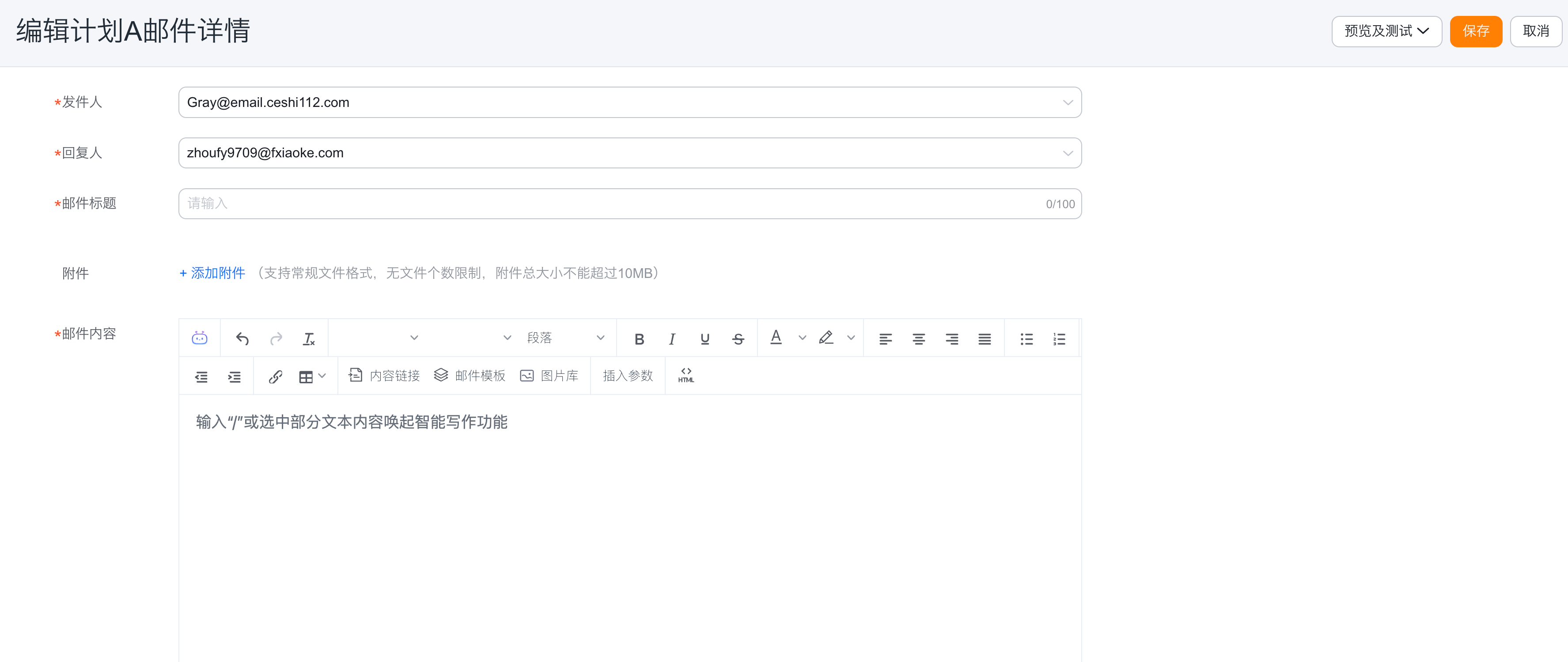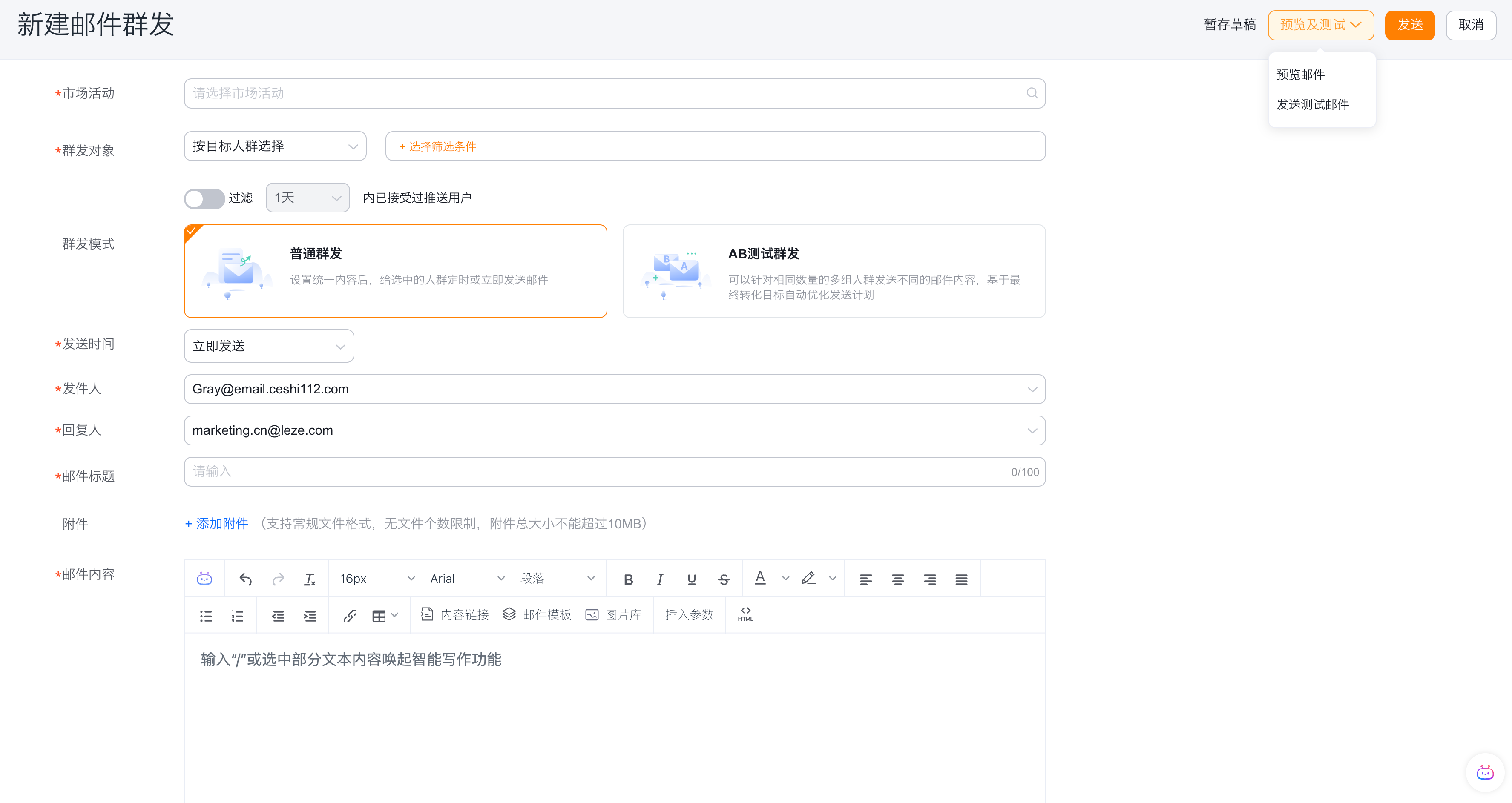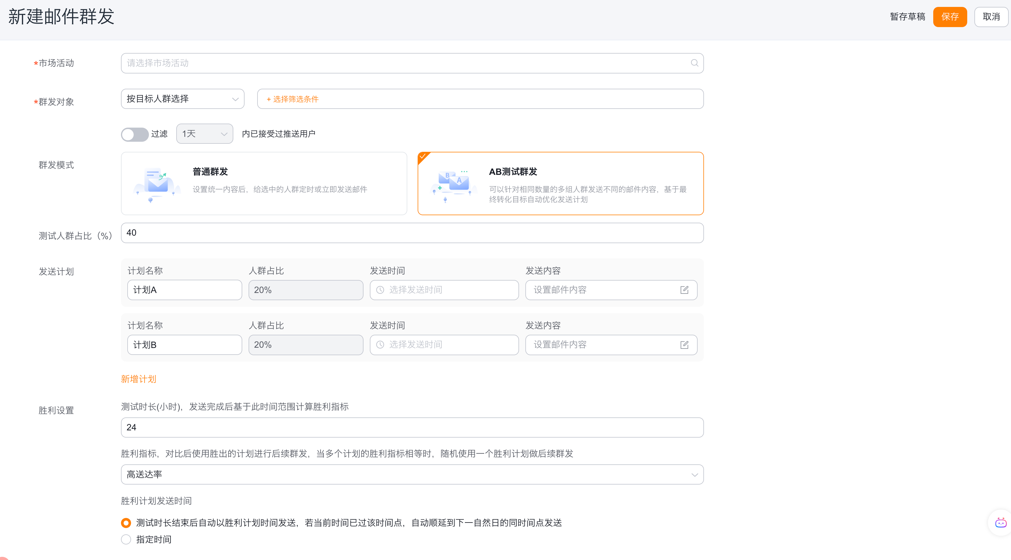 支持配置最多10个计划,可对发送时间、发送邮箱、邮件标题、邮件正文进行多版本对比测试,测试完成后,筛选最优版本全量发送,以数据驱动决策,直接提升打开率、点击率等核心指标