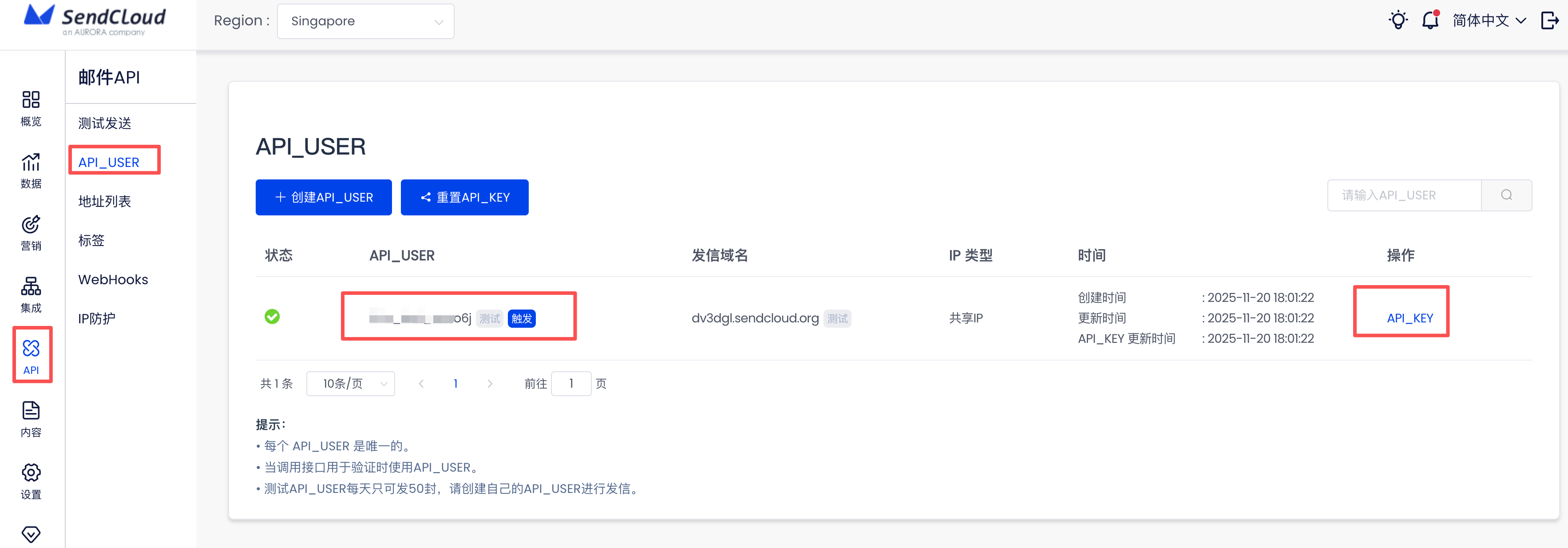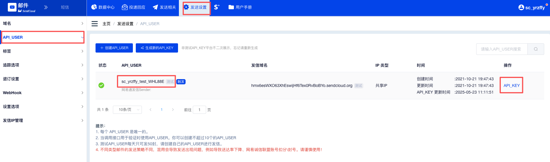 通过营销通绑定完成sendcloud后,营销通会基于默认的API_USER和KEY在sendcloud后台自动新建配置的域名及新建两条新的API_USER, 用于营销邮件(批量)及通知邮件发送(触发),后期请勿变更相关名称及生成新的KEY,会导致营销通发送邮件失败