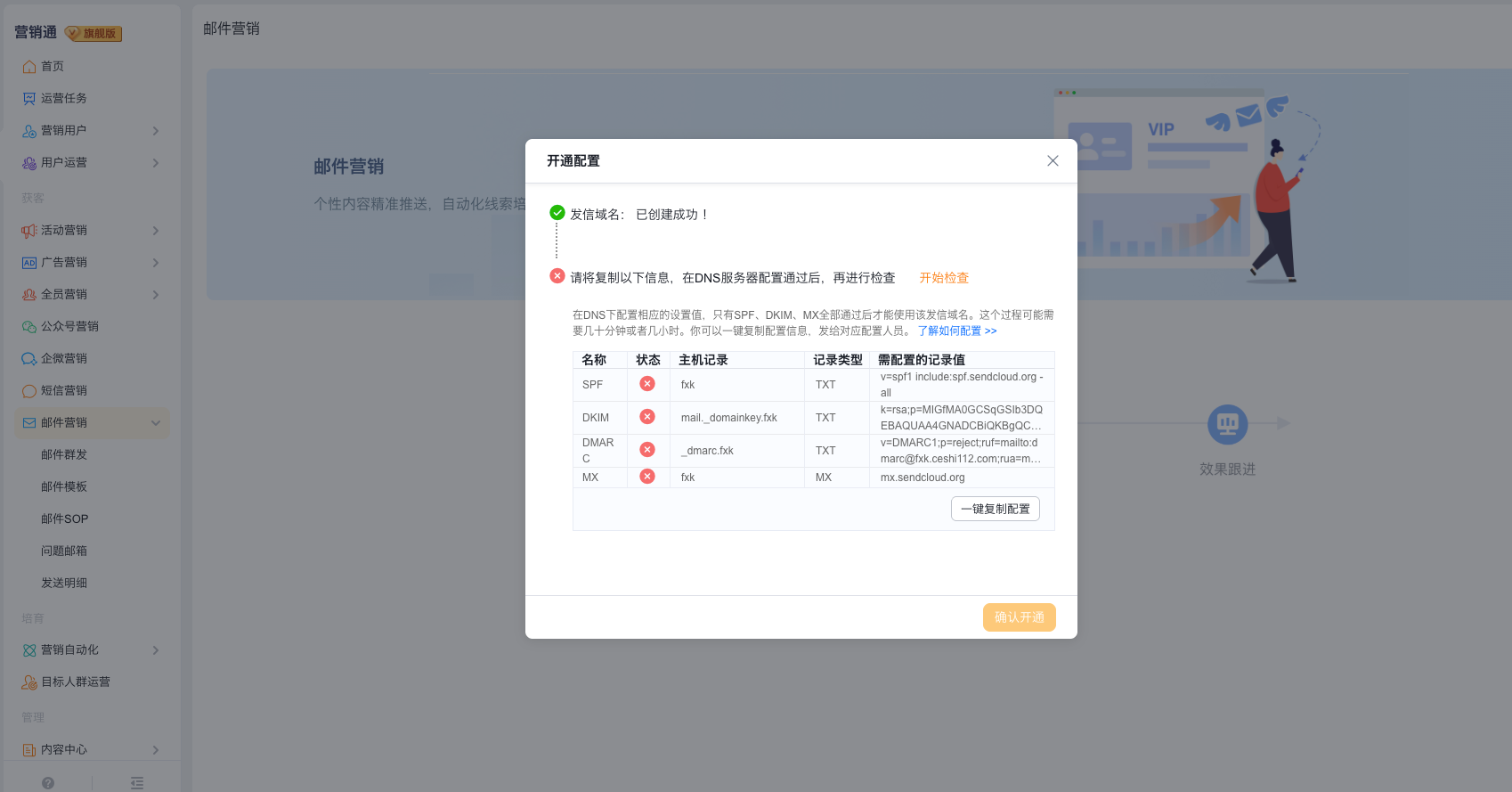 1、访问【营销通】-【邮件营销】,点击【立即开通】,填写上方获取的发信域名、API_USER、API_KEY,点击保存并确认,如果保存不成功,请仔细检查是否有复制错信息。