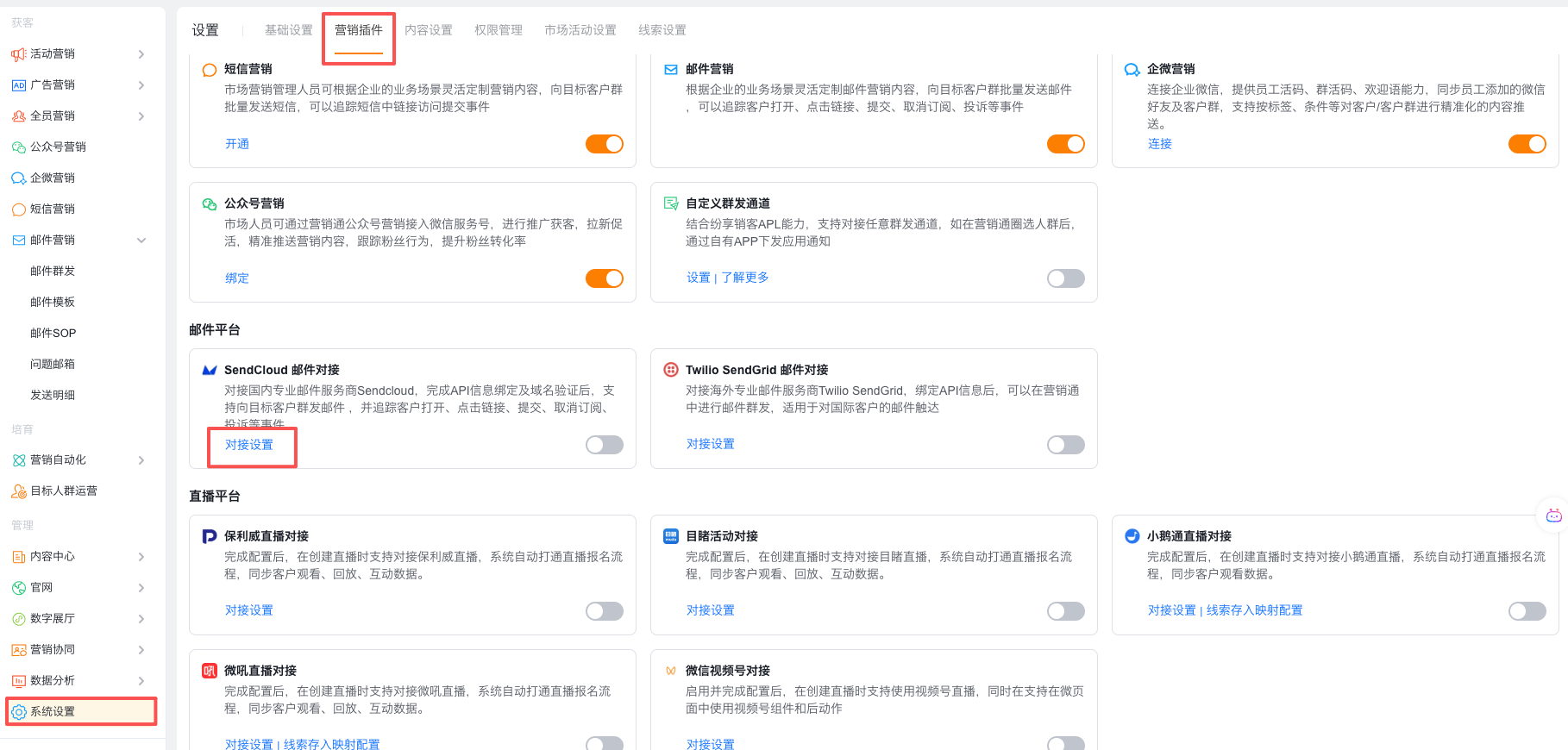 访问营销通【系统设置>营销插件>邮件平台>SendCloud 邮件对接>设置】进行发件人、回复人邮箱设置,用于发送邮件后对外展示的邮箱名称,及回复的邮箱