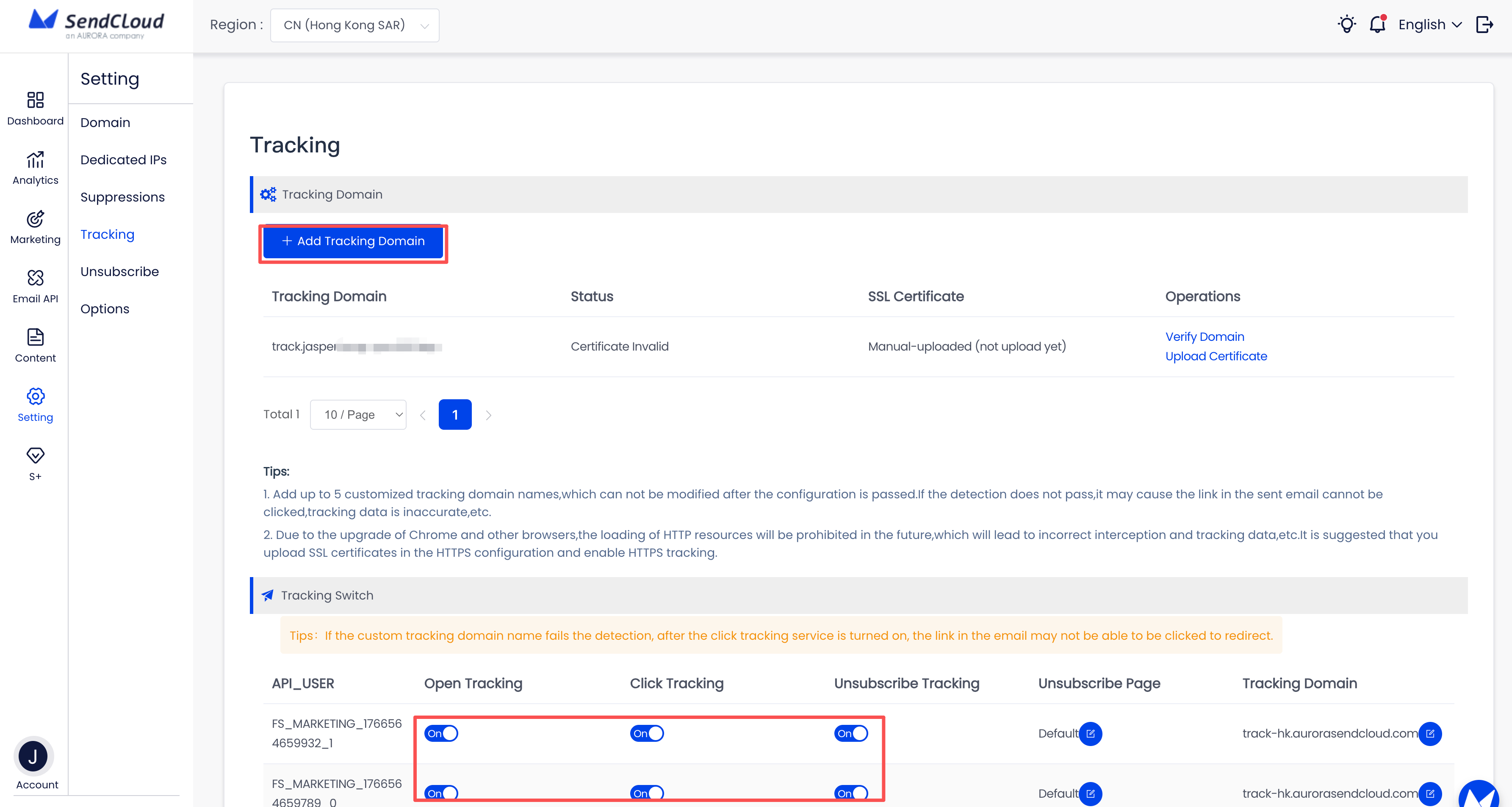 8、前往Sendcloud后台配置追踪域名(不配置不能追踪客户打开、点击、取消订阅等事件);