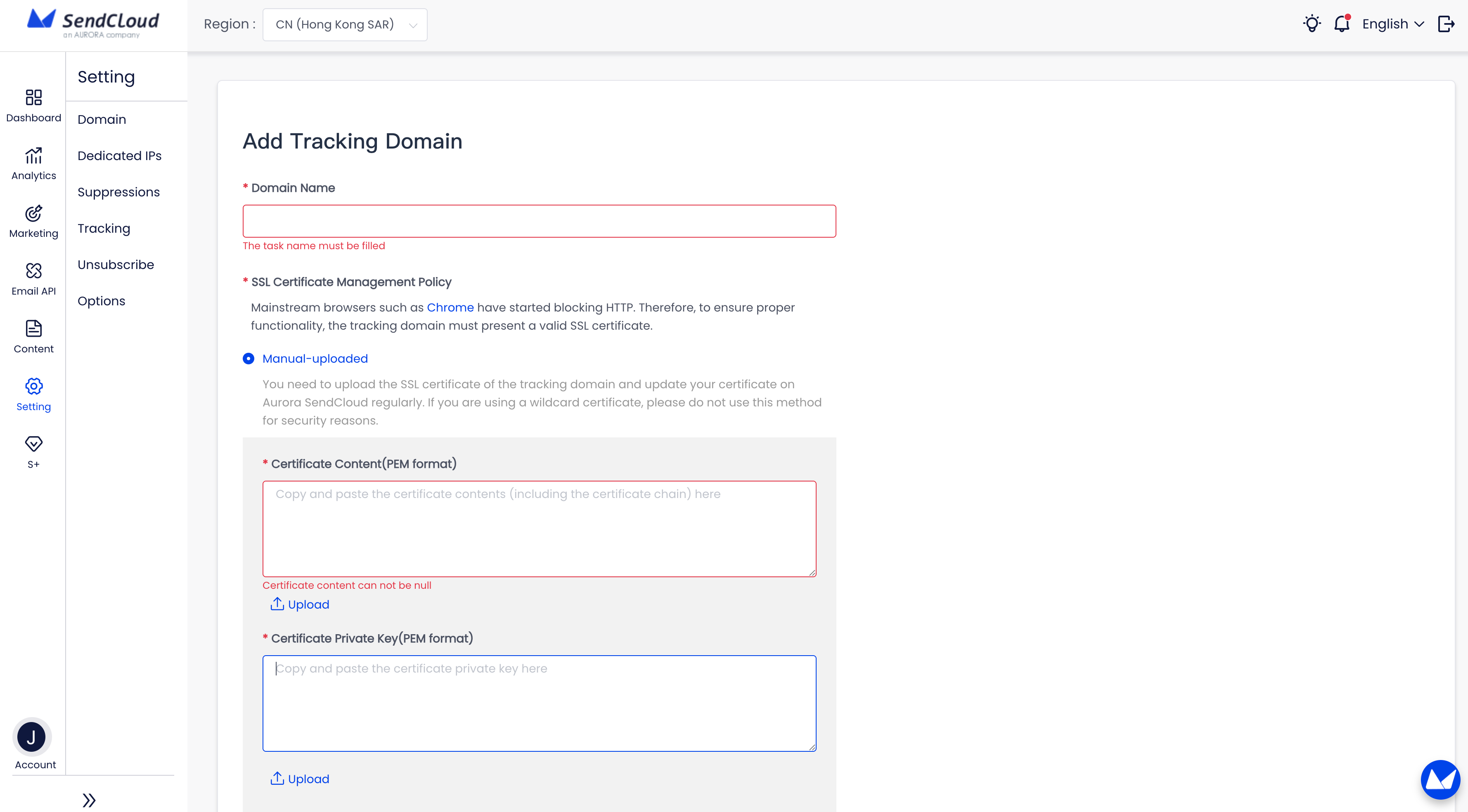 【Sendcloud国际版】可以直接配置域名,需要运维同学提供域名证书及参与DNS配置