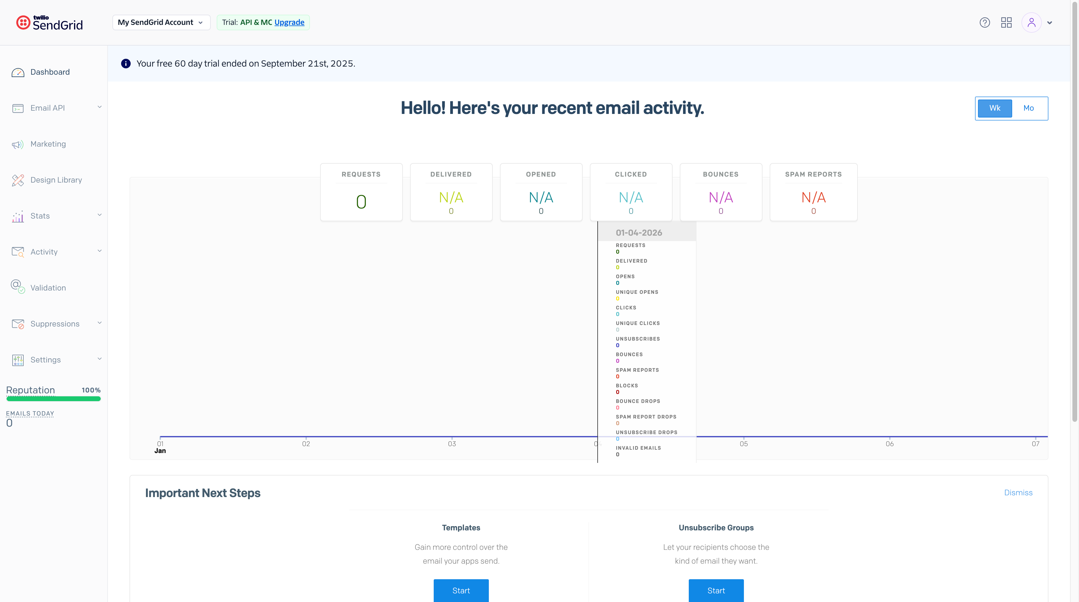 1、前往Sendgrid注册账号 官网:https://sendgrid.com/en-us ,若是中国大陆访问注册,需要使用VPN,使用美国节点,建议使用gmail邮箱注册(有风控机制,可能注册了不给登录使用),注册后若无法正常登录,可以联系客户经理进行内部沟通开放。有60天免费试用期,每天可以发100条邮件。后续可以充值升级版本扩容。