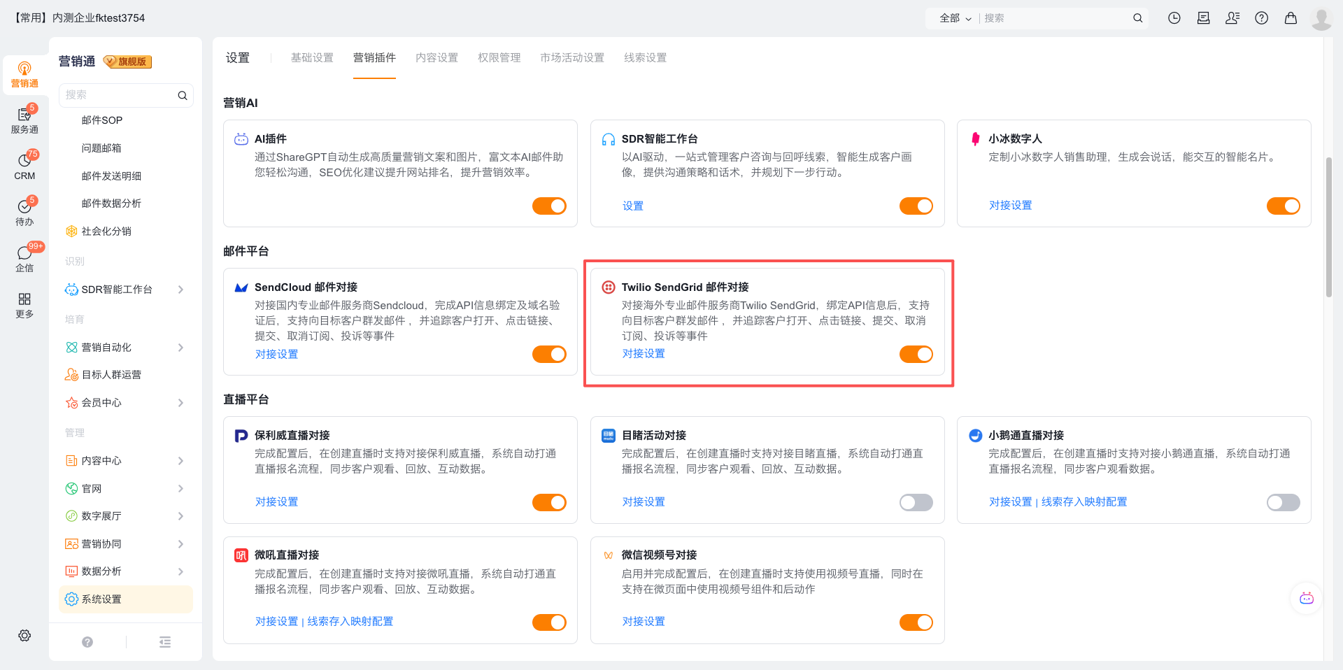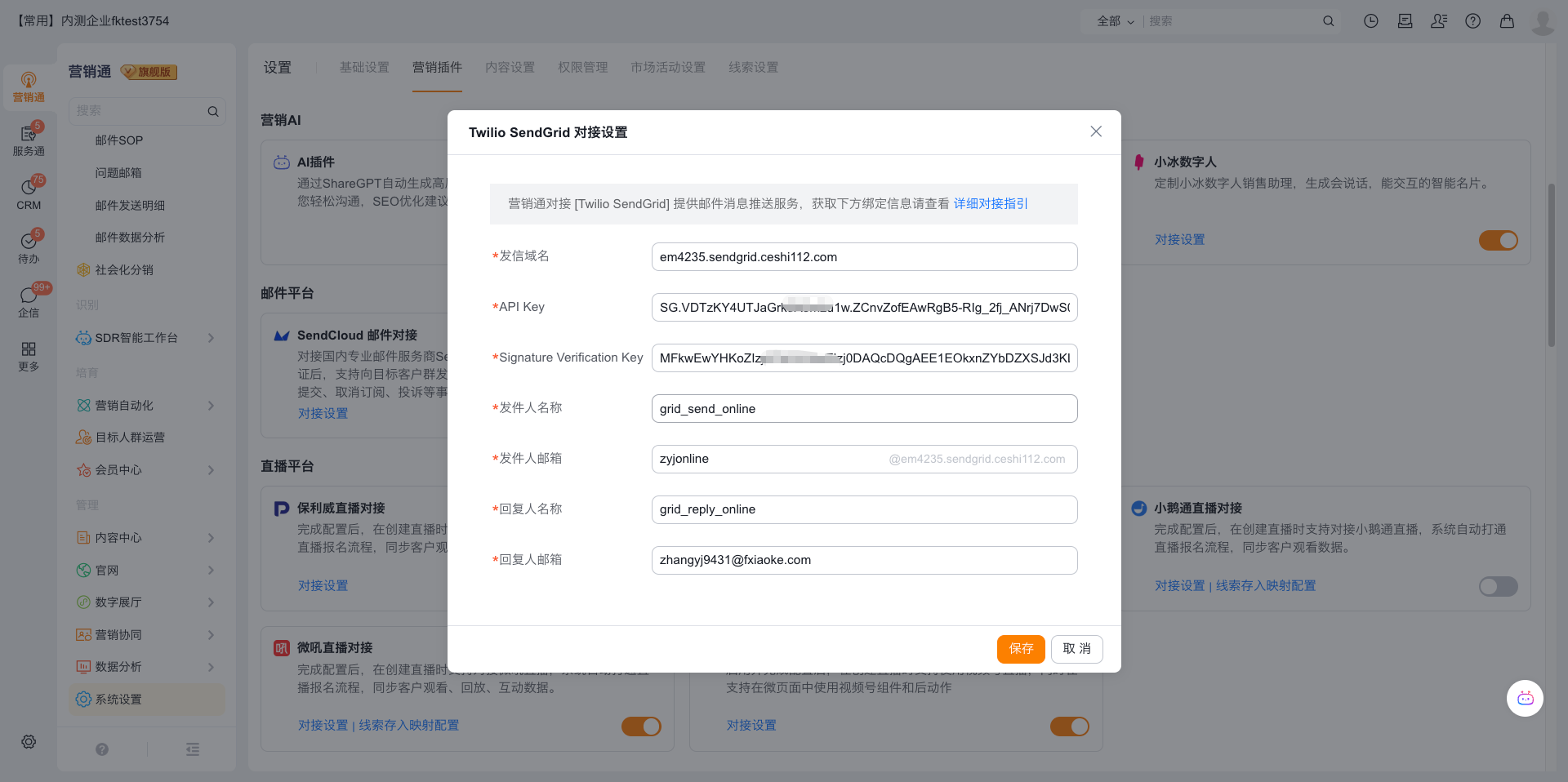 5、在营销通插件中绑定API信息,发件人和回复人信息可以按企业需求自定义。