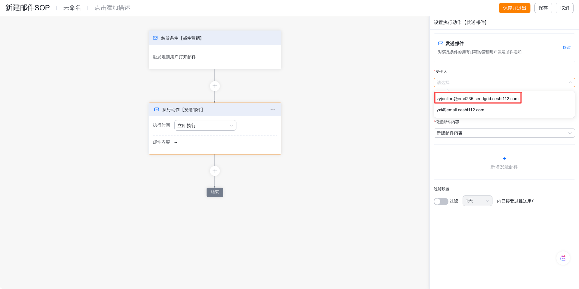 6、在邮件群发入口,SOP中,可以选择到Sendgrid账号的发件人及回复人。