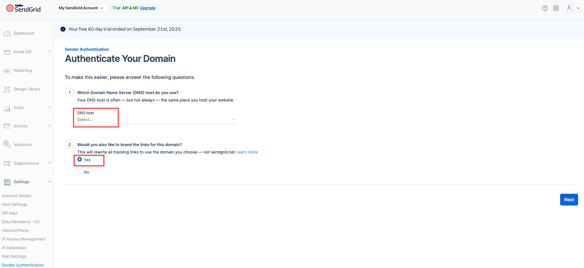 c、如果期望邮件正文中的链接鼠标hover的时候,展示企业专属的域名,第2步,请选yes,也可以不选,默认使用sendgrid的域名。