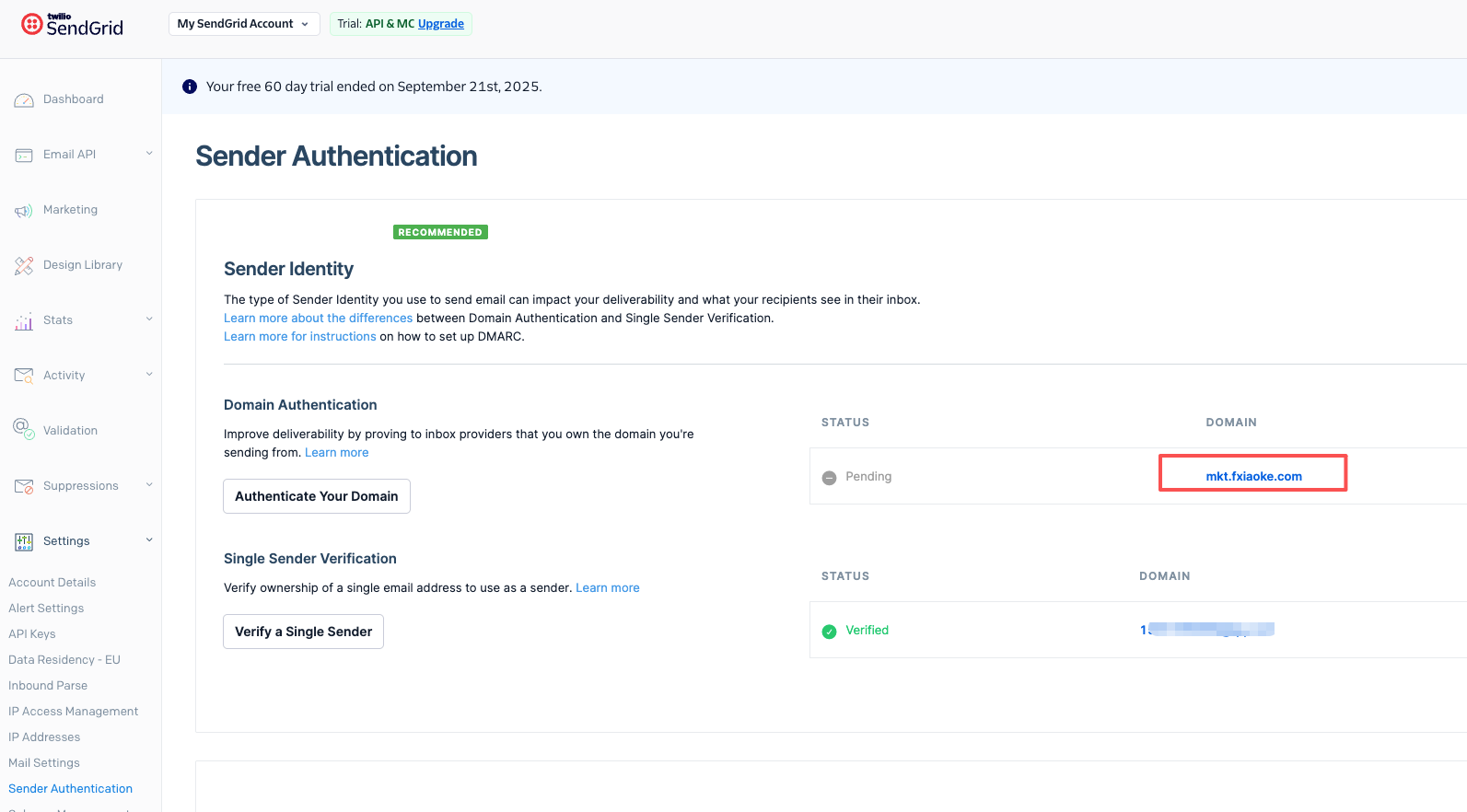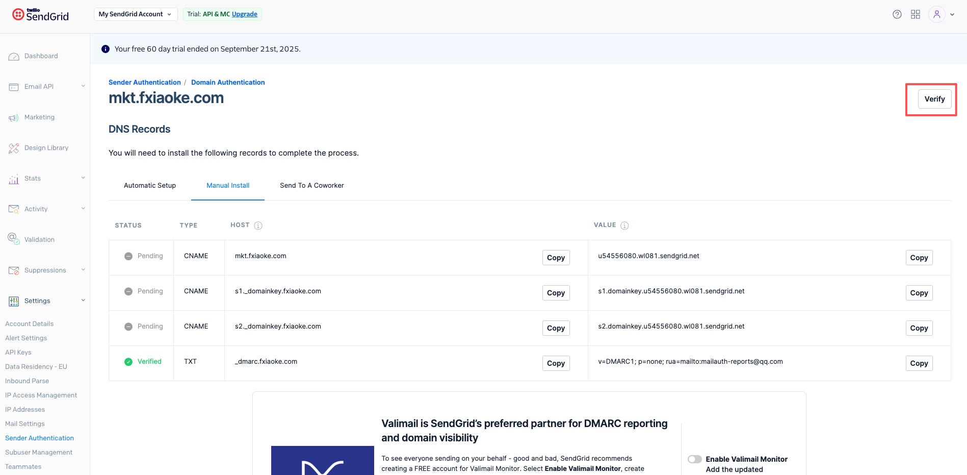 3、在SendGrid后台完成Domain类型的发件人验证,主要是配置发送营销邮件的发件域名信息。