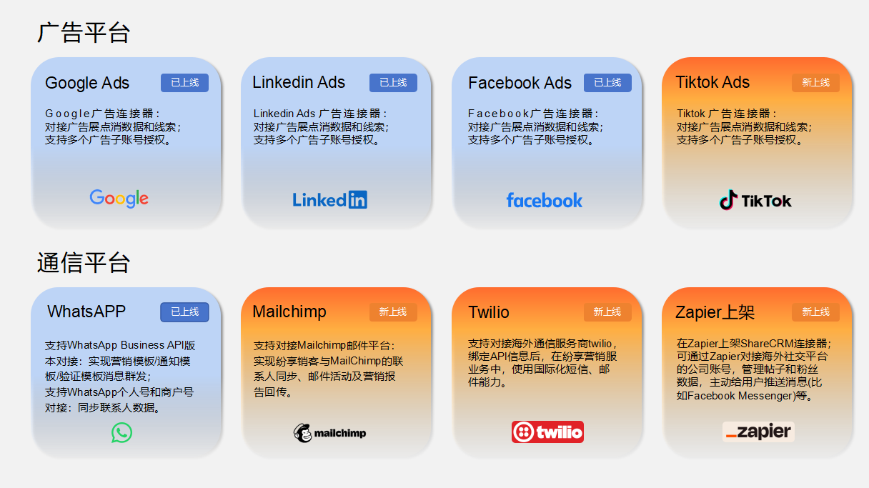 💡我们的方案: 深度打通TikTok Ads、WhatsApp、Mailchimp、Twilio等海外主流渠道,广告数据与互动信息自动同步至客户档案。同时可通过国际短信、邮件触达海外用户。