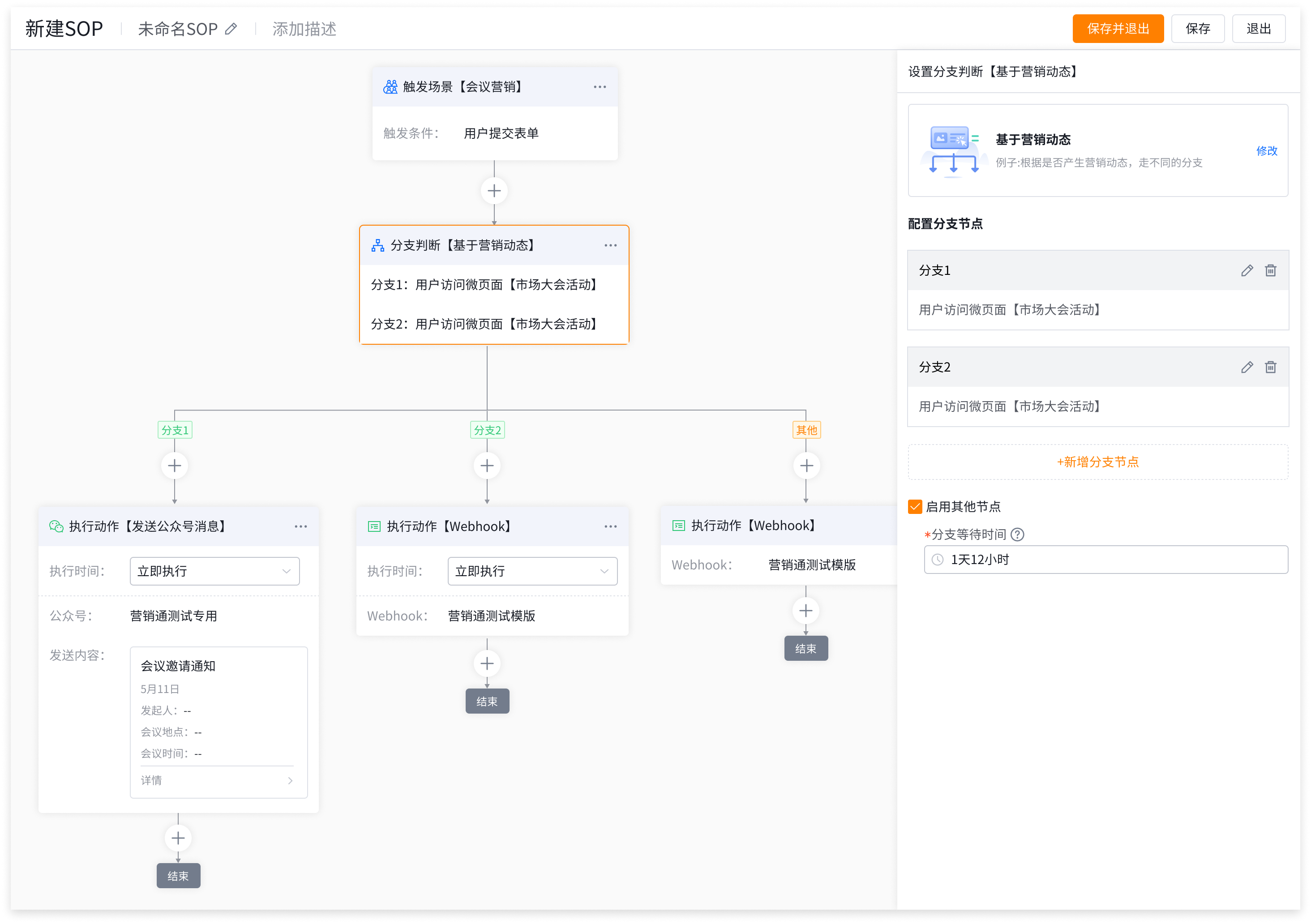 💡我们的方案: 在各场景SOP中新增分支判断能力。可根据客户提交数据、新增标签、互动行为等条件,自动执行不同后续动作。