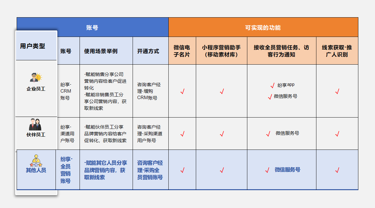 🚀使用方式:给需要赋能的员工、伙伴、个人开通对应账号(CRM账号、渠道用户账号、全员营销账号)后配置使用,账号开通请咨询客户经理。