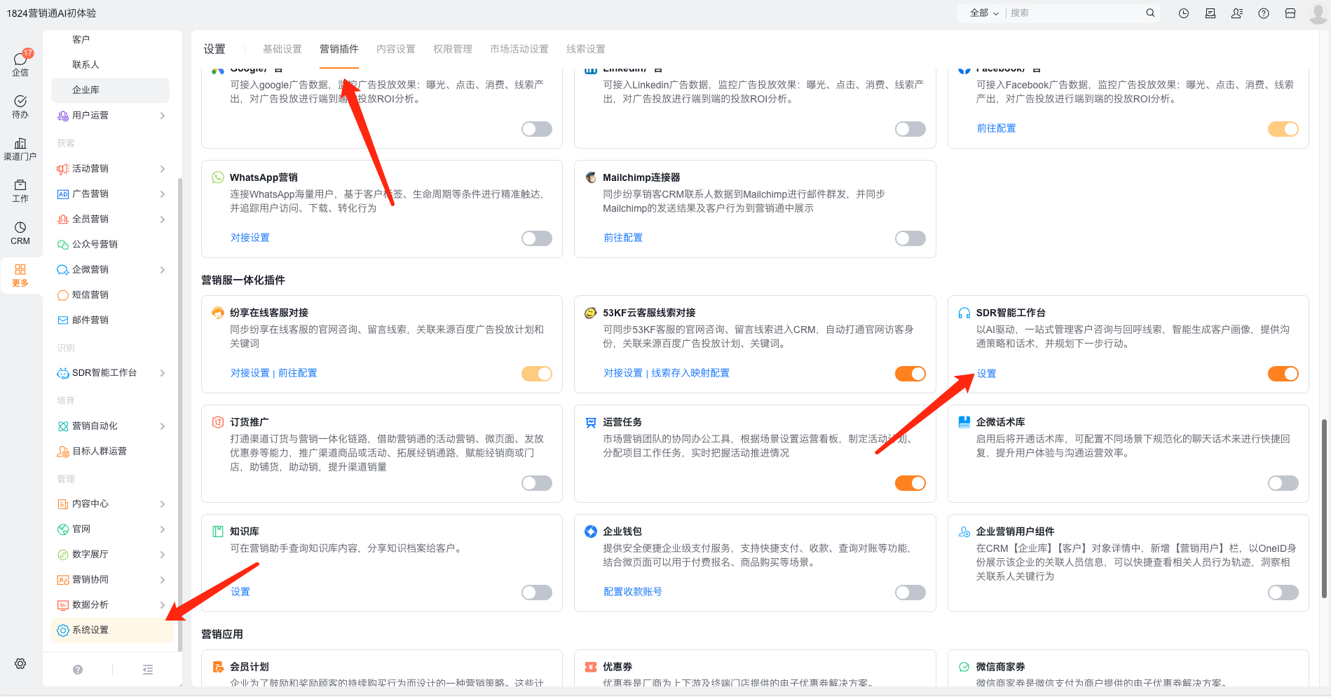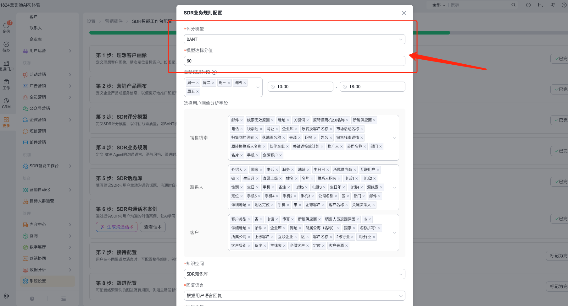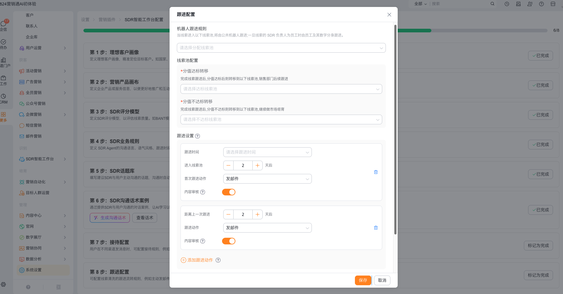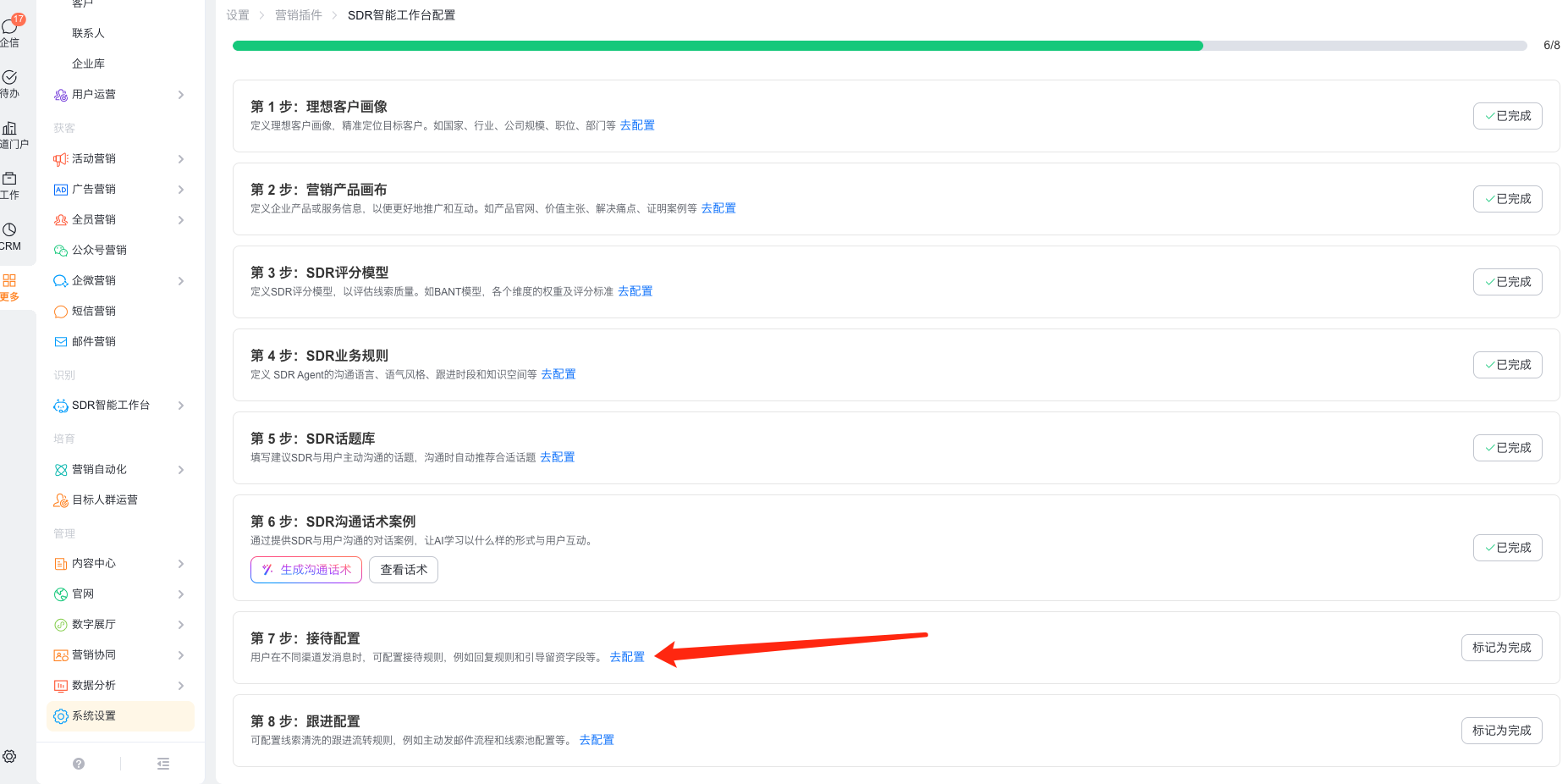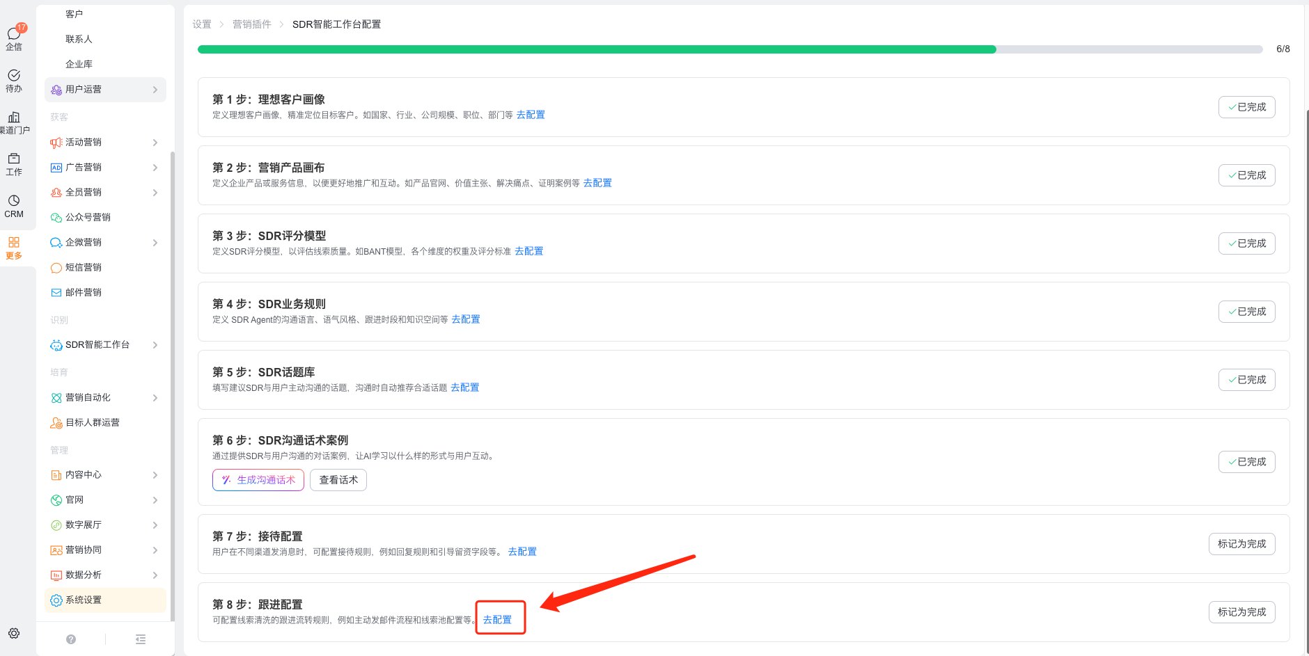 1、前往营销通>系统设置>营销插件>SDR智能工作台进行设置,详见:https://help.fxiaoke.com/93d5/c8de/6031/5550。其中核心配置跟进规则。