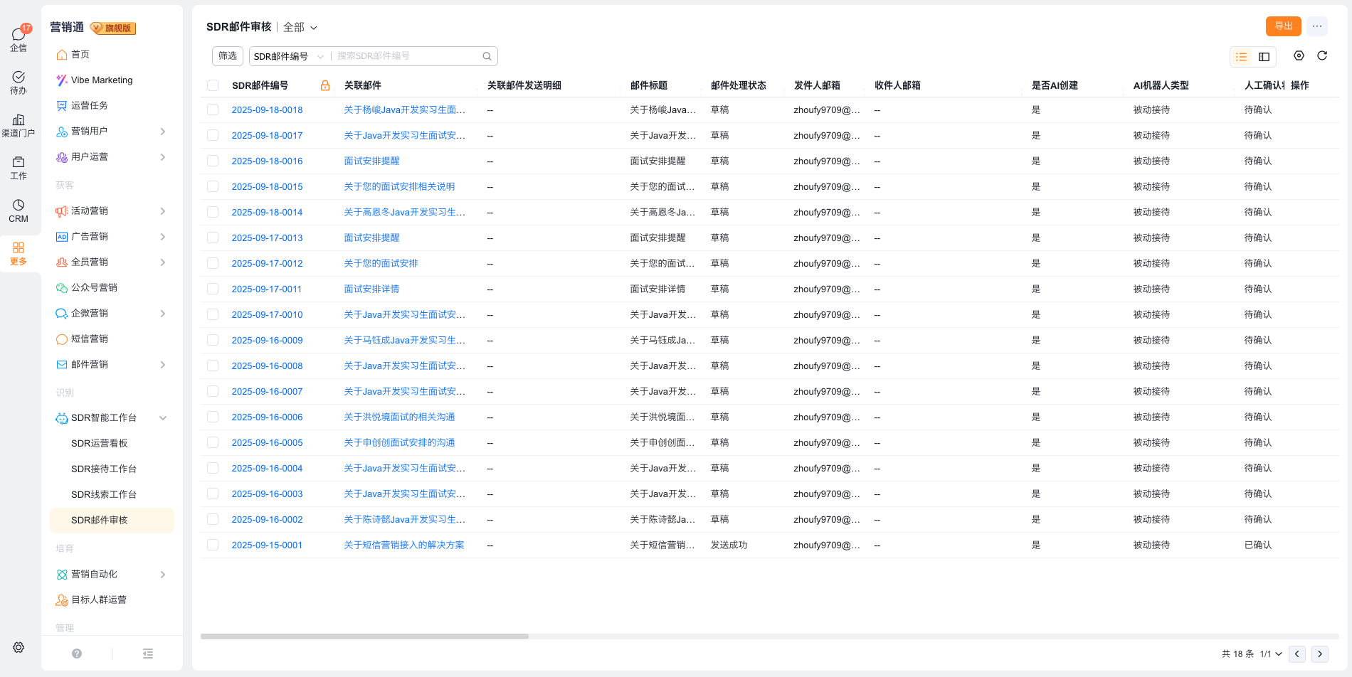 3、配置完成后,一旦线索进入配置的机器人跟进线索池,机器人将自动按照规则给线索写邮件,若开启了审核,邮件将进入审核列表。