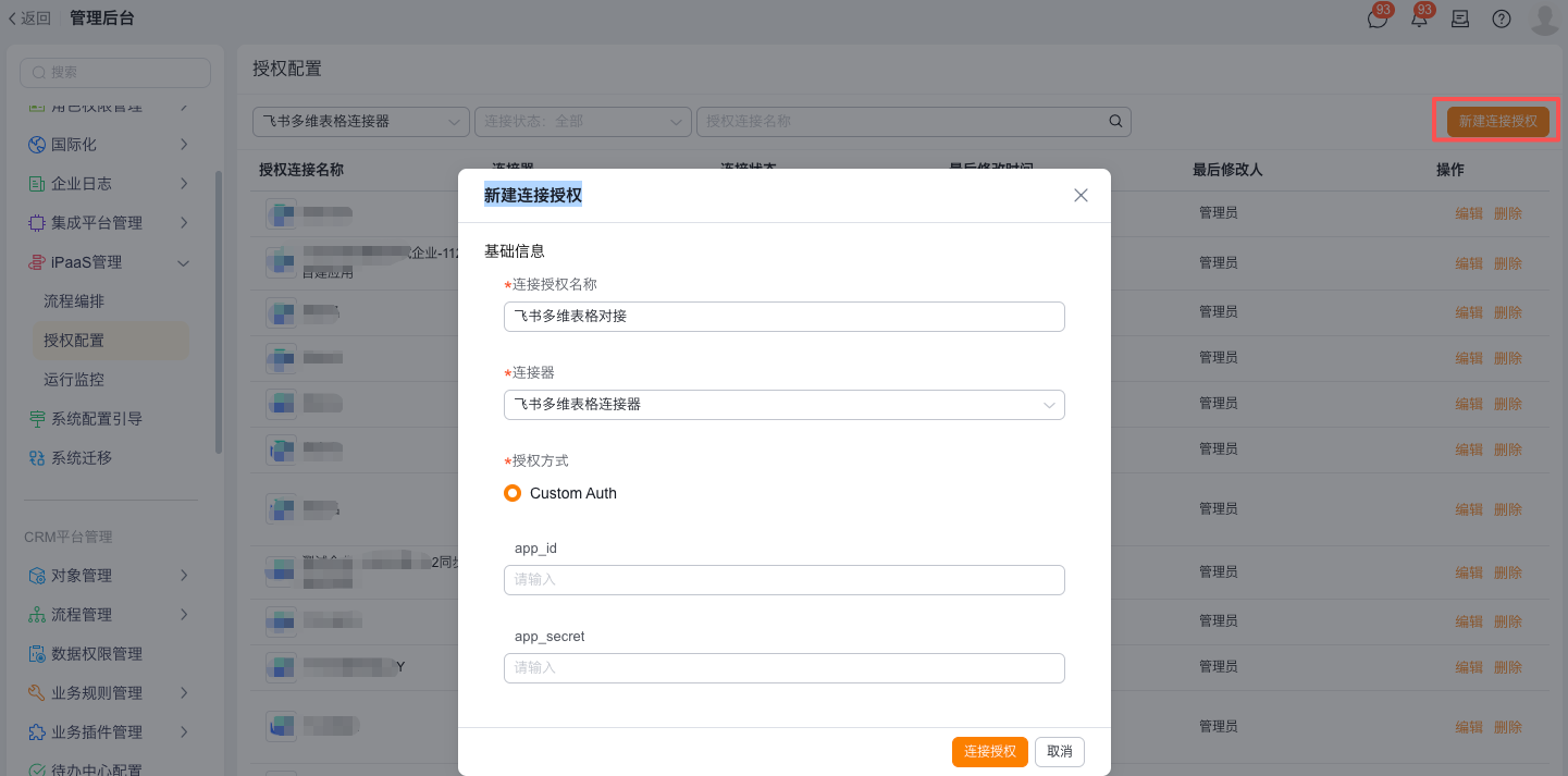 进入ipaas管理>授权配置,新建连接授权,按提示填写授权信息: