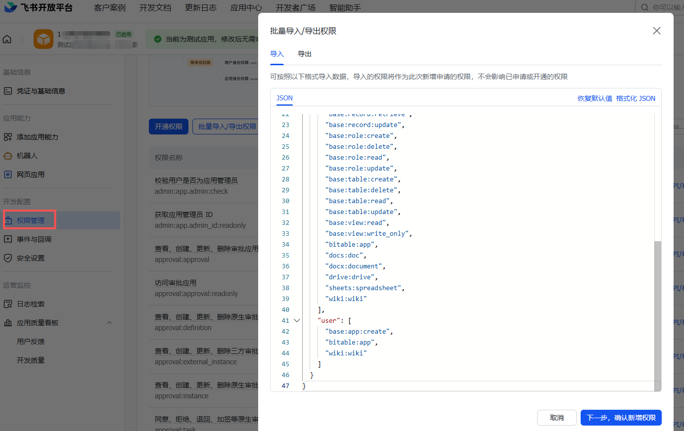 接着配置应用权限,将如下权限列表导入到权限管理,如下图所示: