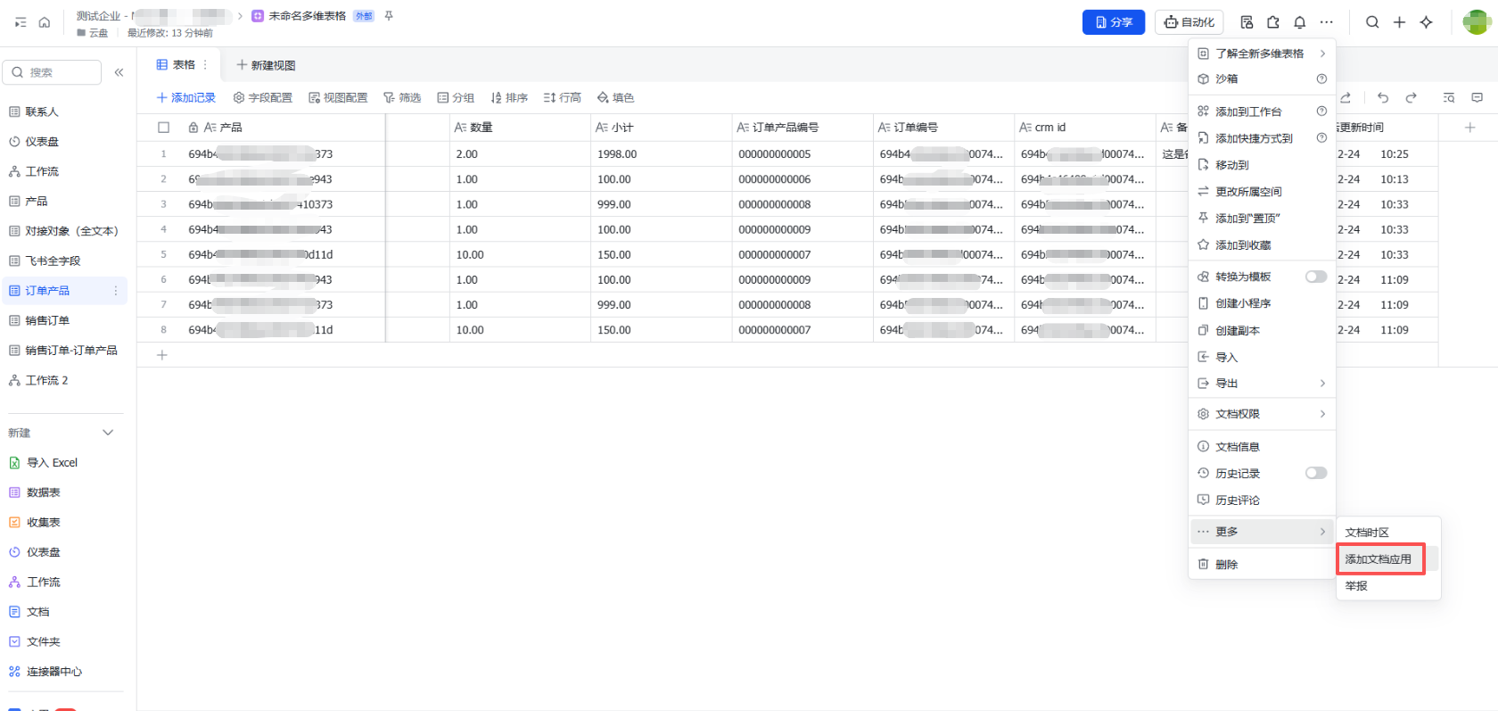 最后在飞书多维表格配置 添加文档应用 ,如下图: